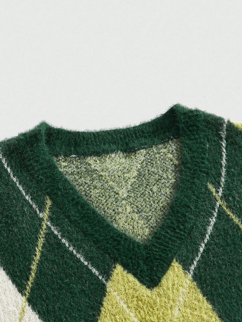 ROMWE MEN Prep Suéter de Manga Longa Folgado com Estampa Xadrez Jacquard Mascul