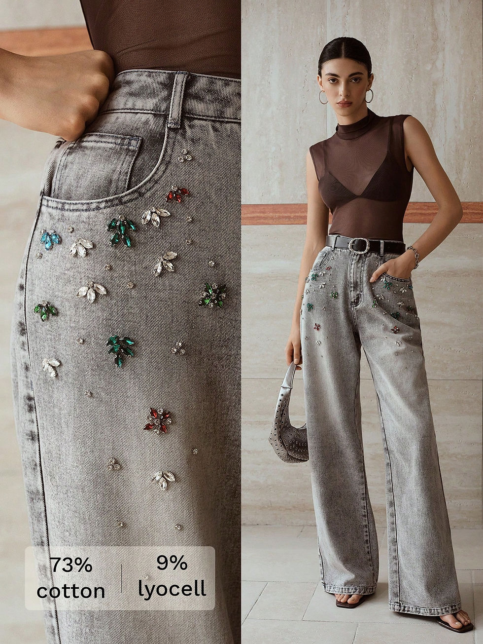Anewsta Calça Jeans Preto de Perna Reta com Strass da Chaebol Heavy Industry pa