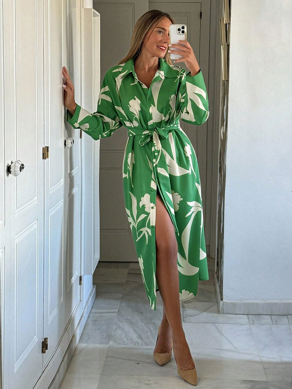 Livesso Vestido Midi de Manga Longa com Cintura Marcada e Estampa Floral Verde