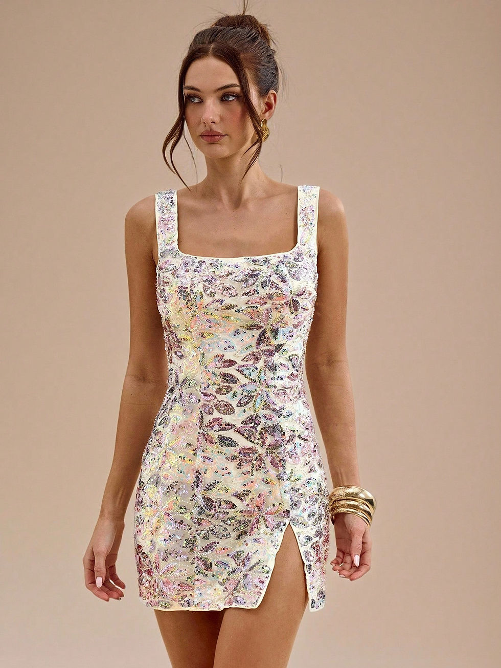 ASTRO BAE Vestido Curto Elegante com Alças Finas e Lantejoulas Florais, Vestido