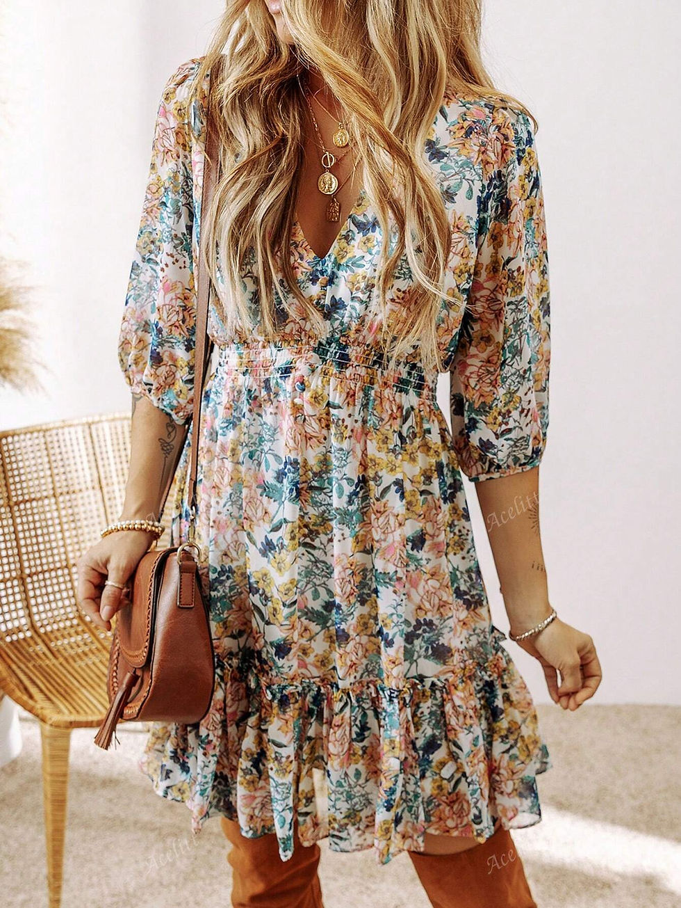 Acelitt Vestido Franzido de Cintura Alta com Babado e Estampa Floral Fofa e Cas