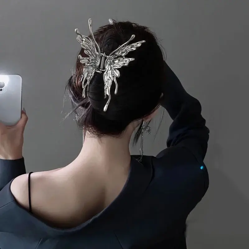 2 pçs grandes garras de cabelo borboleta oca para mulheres preto prata cor lega