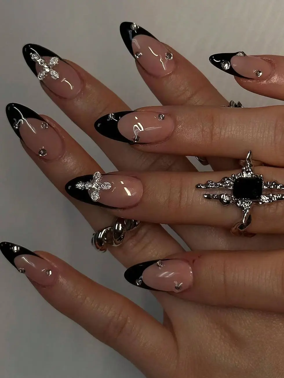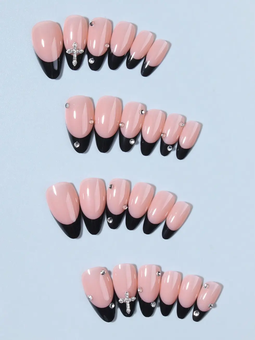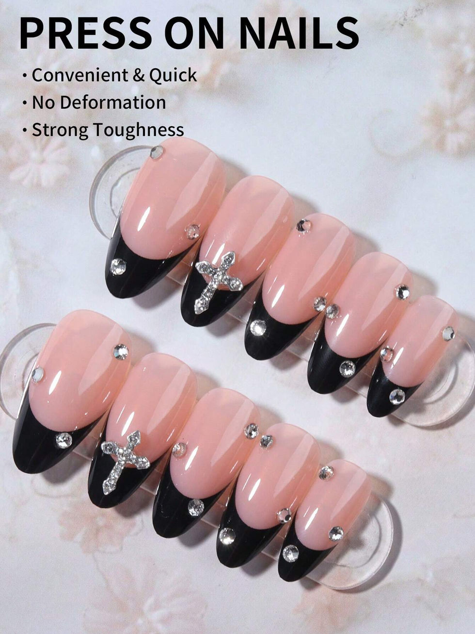 24 Peças Unhas Postiças Pretas de Amêndoa 3D com Design de Cruz em Liga, Ponta