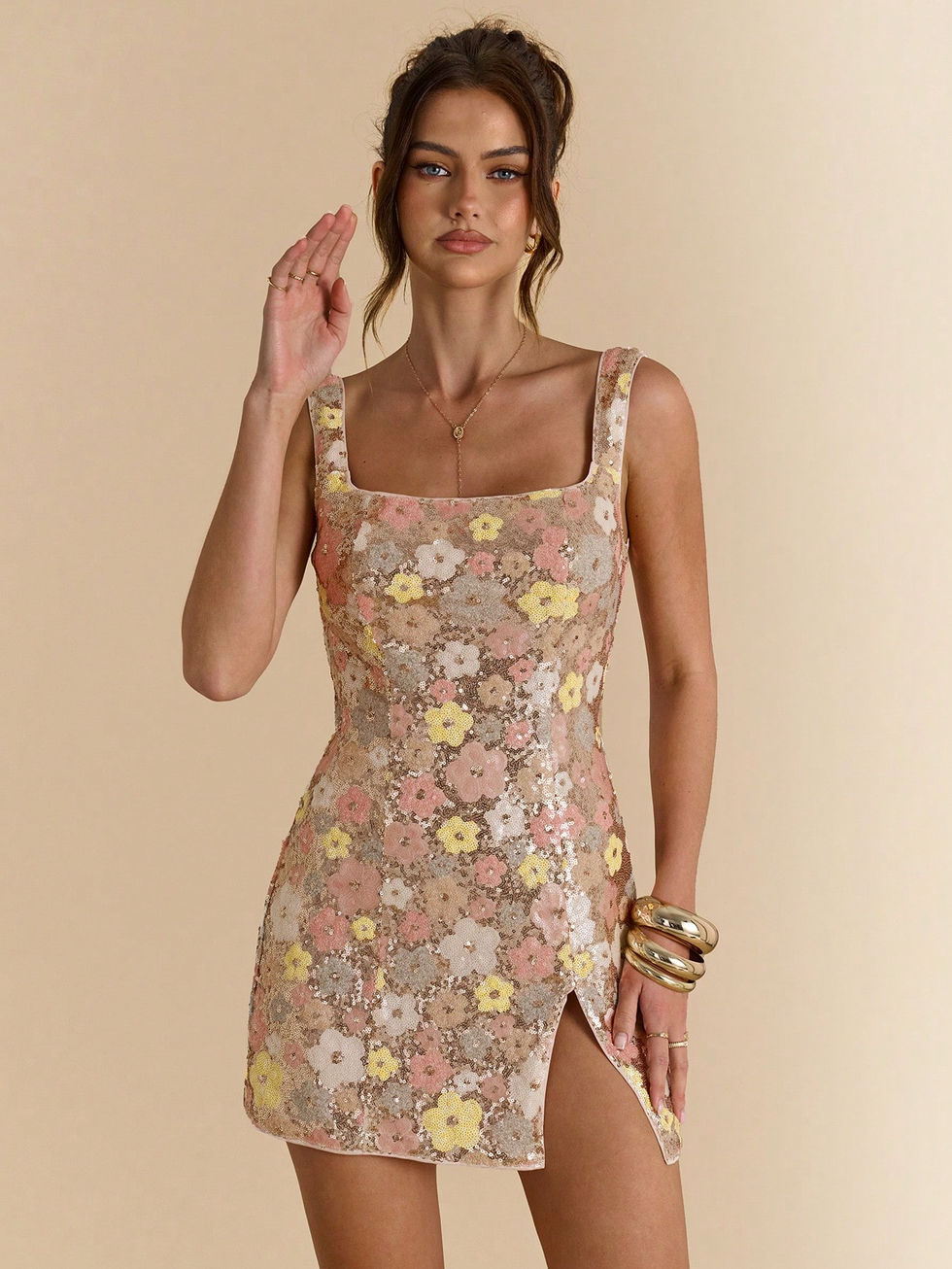 ASTRO BAE Vestido Curto Elegante com Alças Finas e Lantejoulas Florais, Vestido