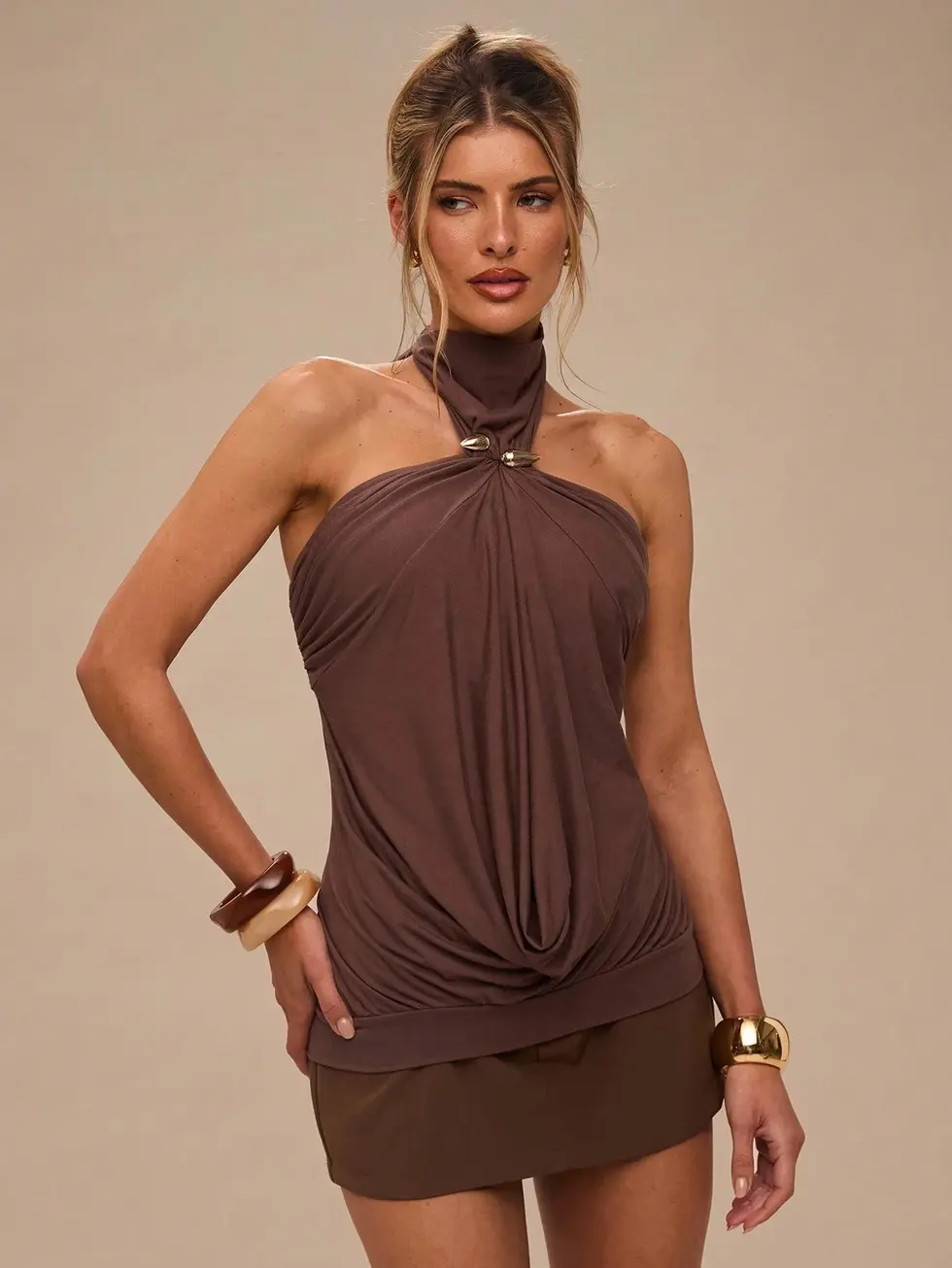 BAE Blusa de Gola Alta Feminina de Cor Sólida com Decoração de Fivela de Metal,