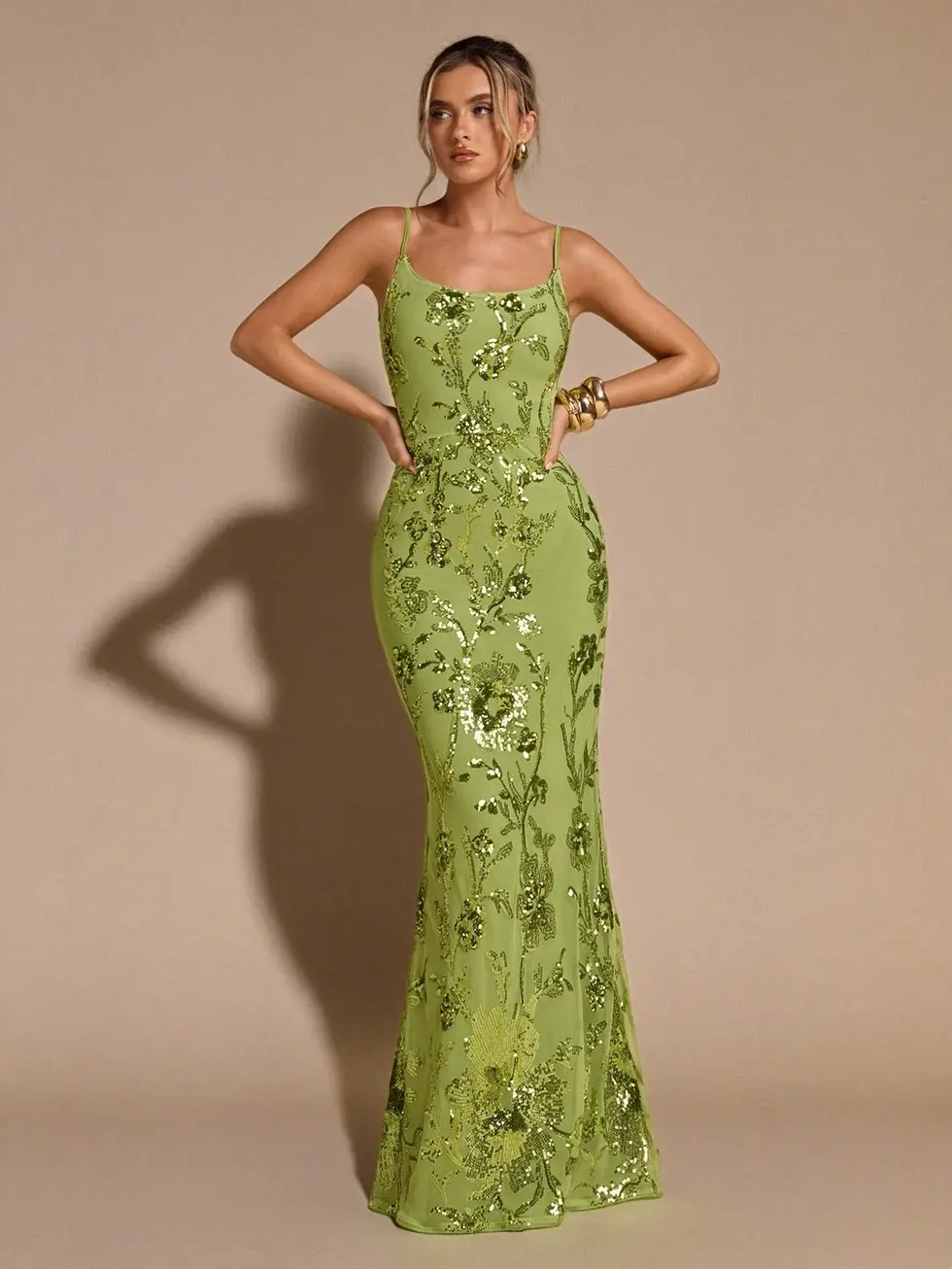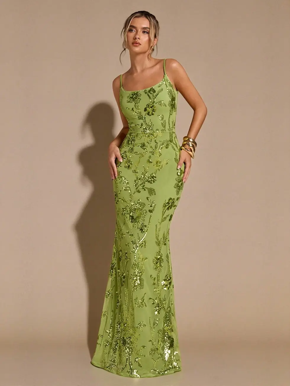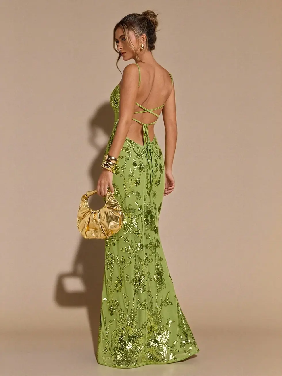 BAE Vestido Longo Maxi com Alças de Amarrar, Bordado Floral 3D, Sólido Verde, P