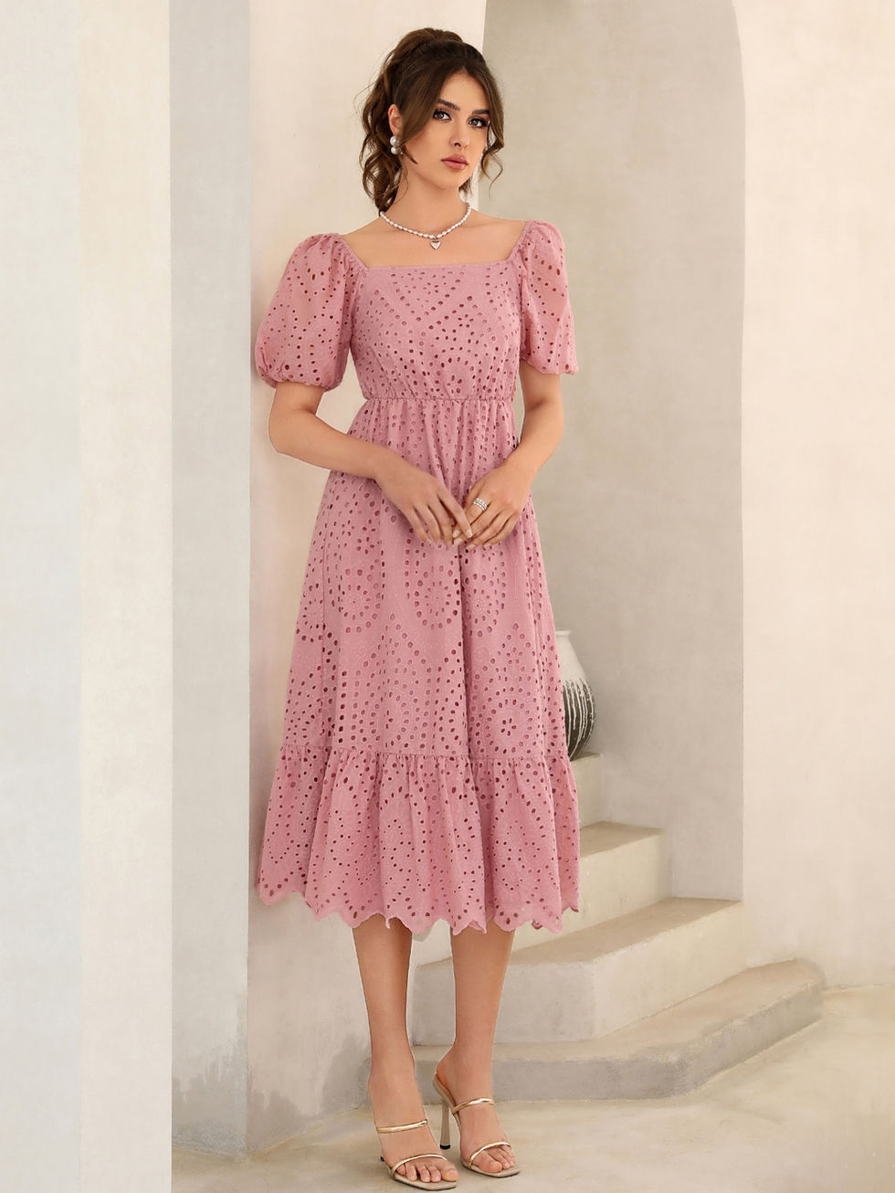 Bainha de Ruffle Bordado de ilhó Simples elegante Vestido