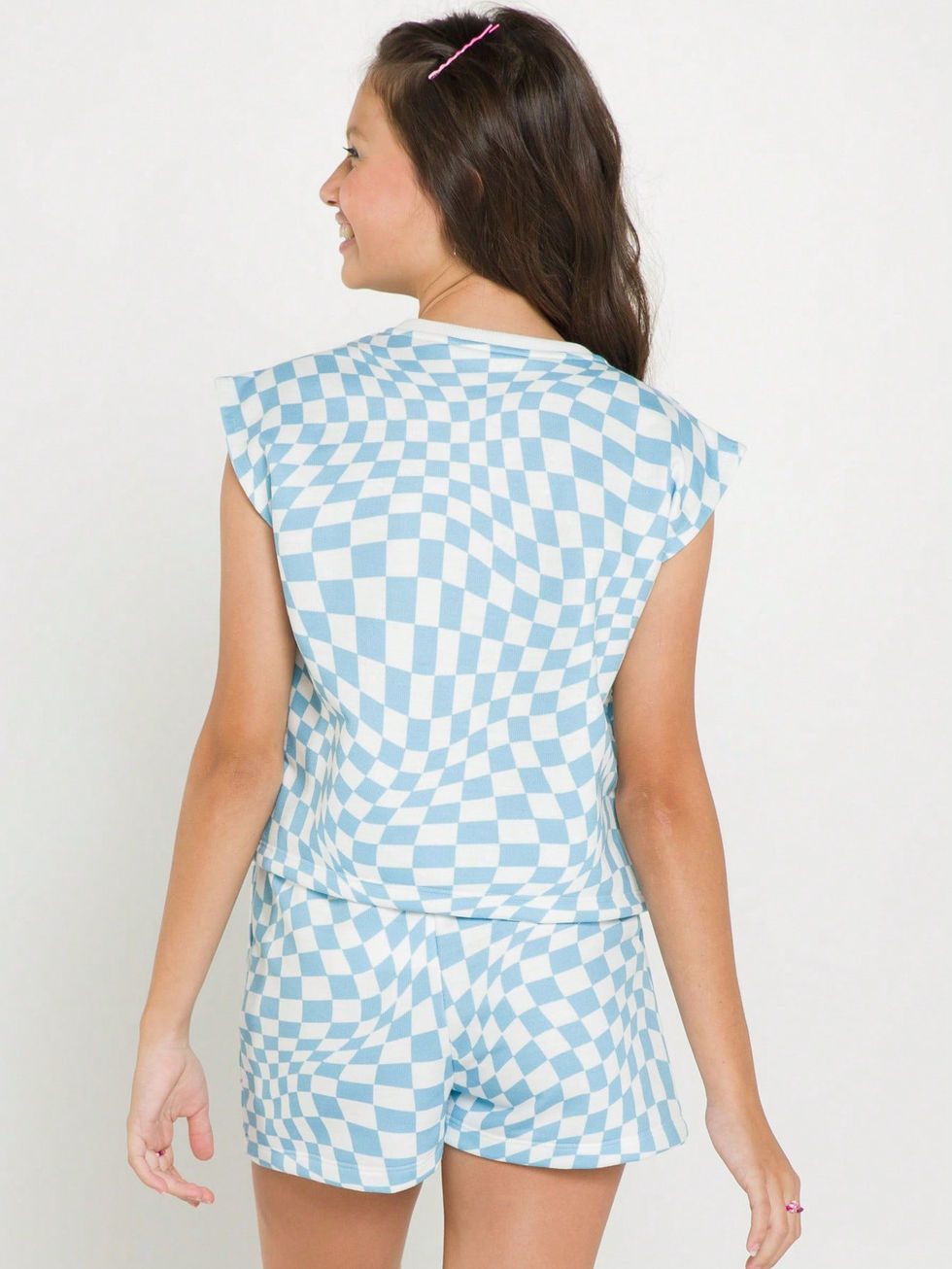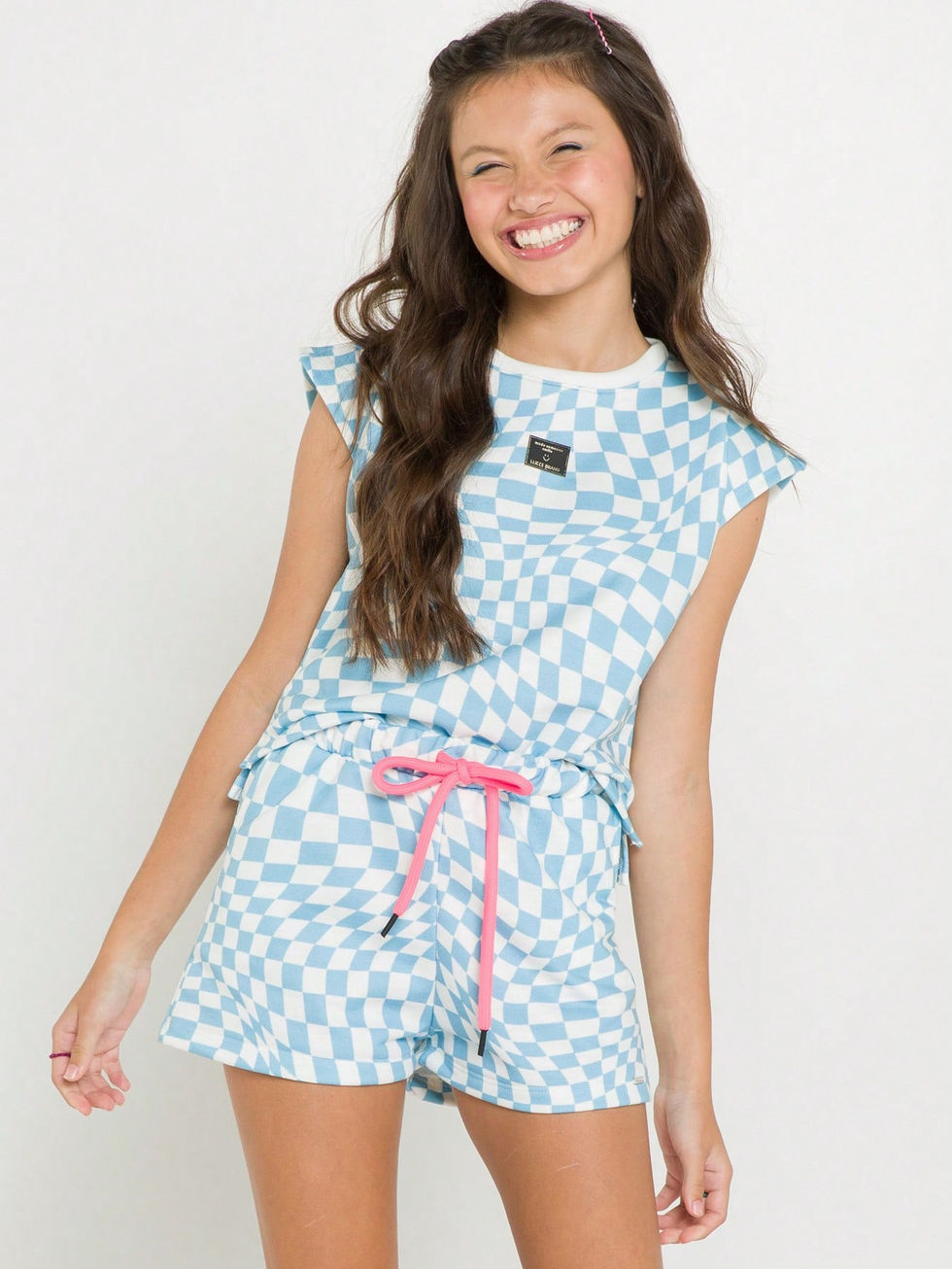 Blusa Cropped Estampada Quadriculada de Manga Curta