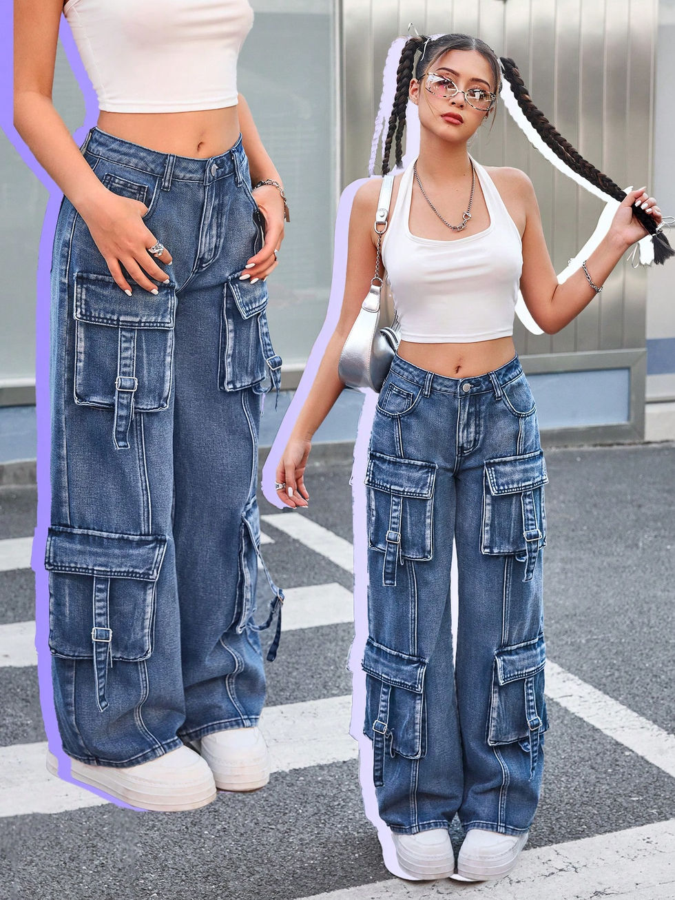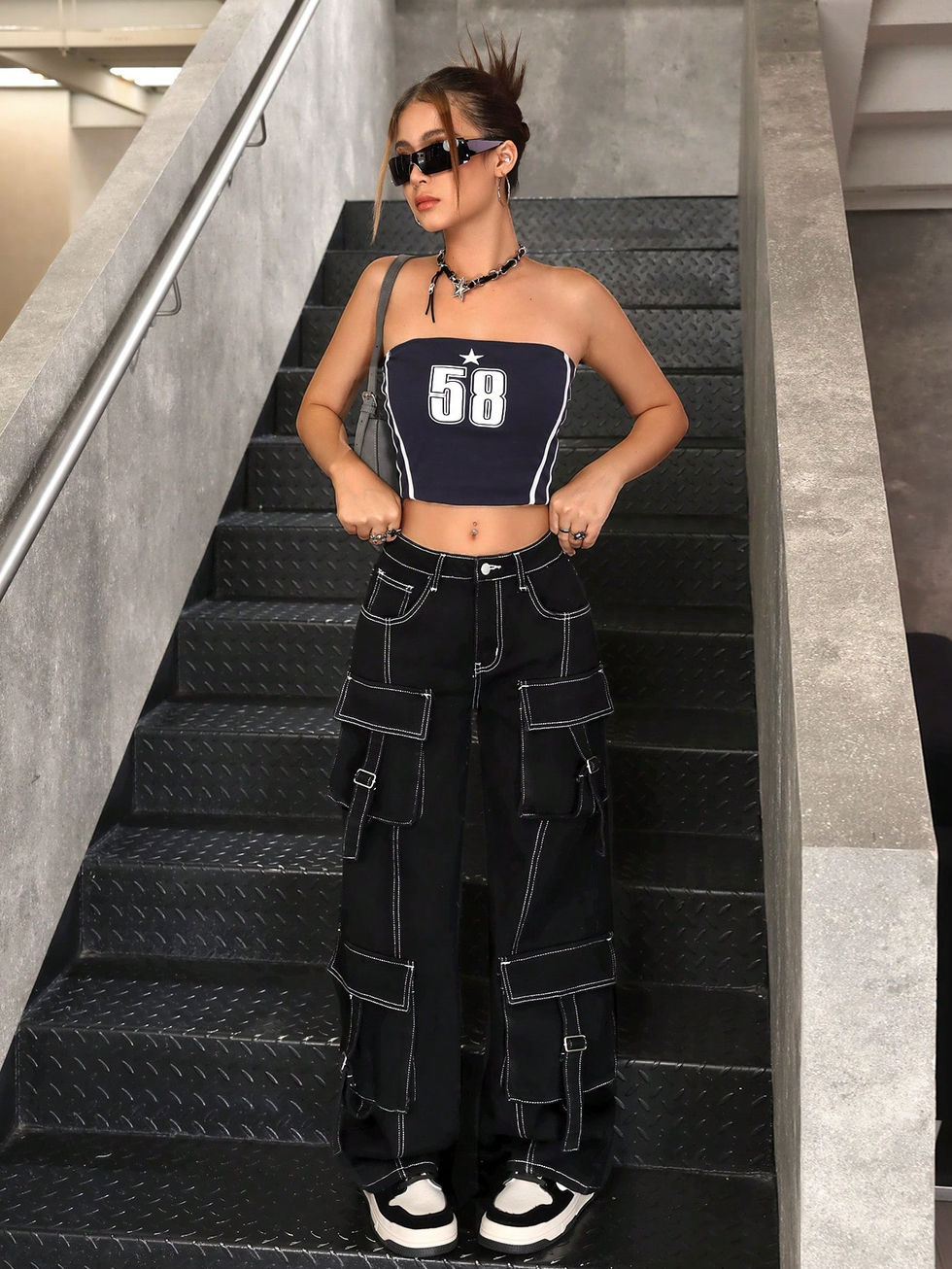 Calça Denim Reta de Cintura Baixa e Ajuste Largo com Costura Contrastante Preta