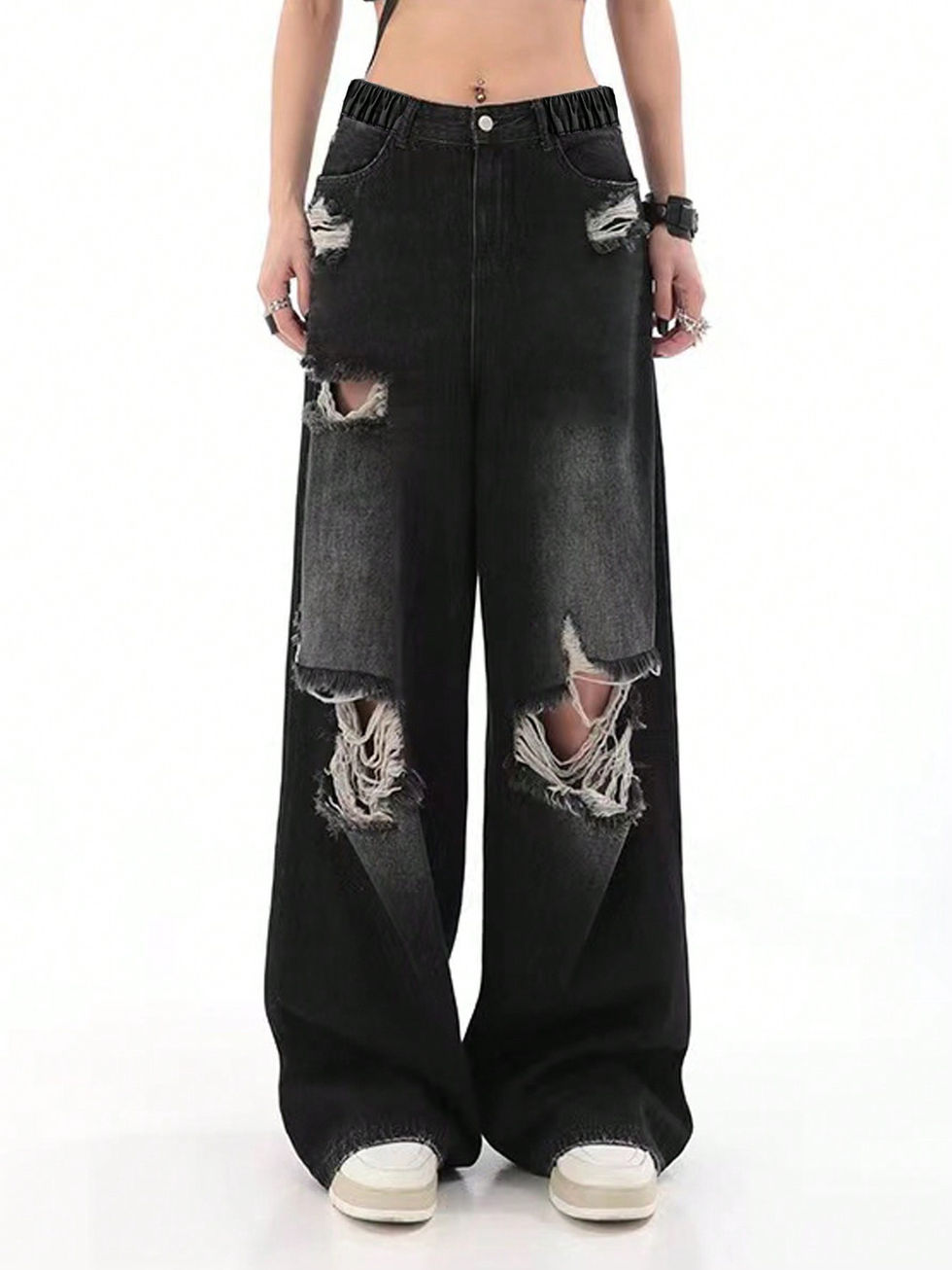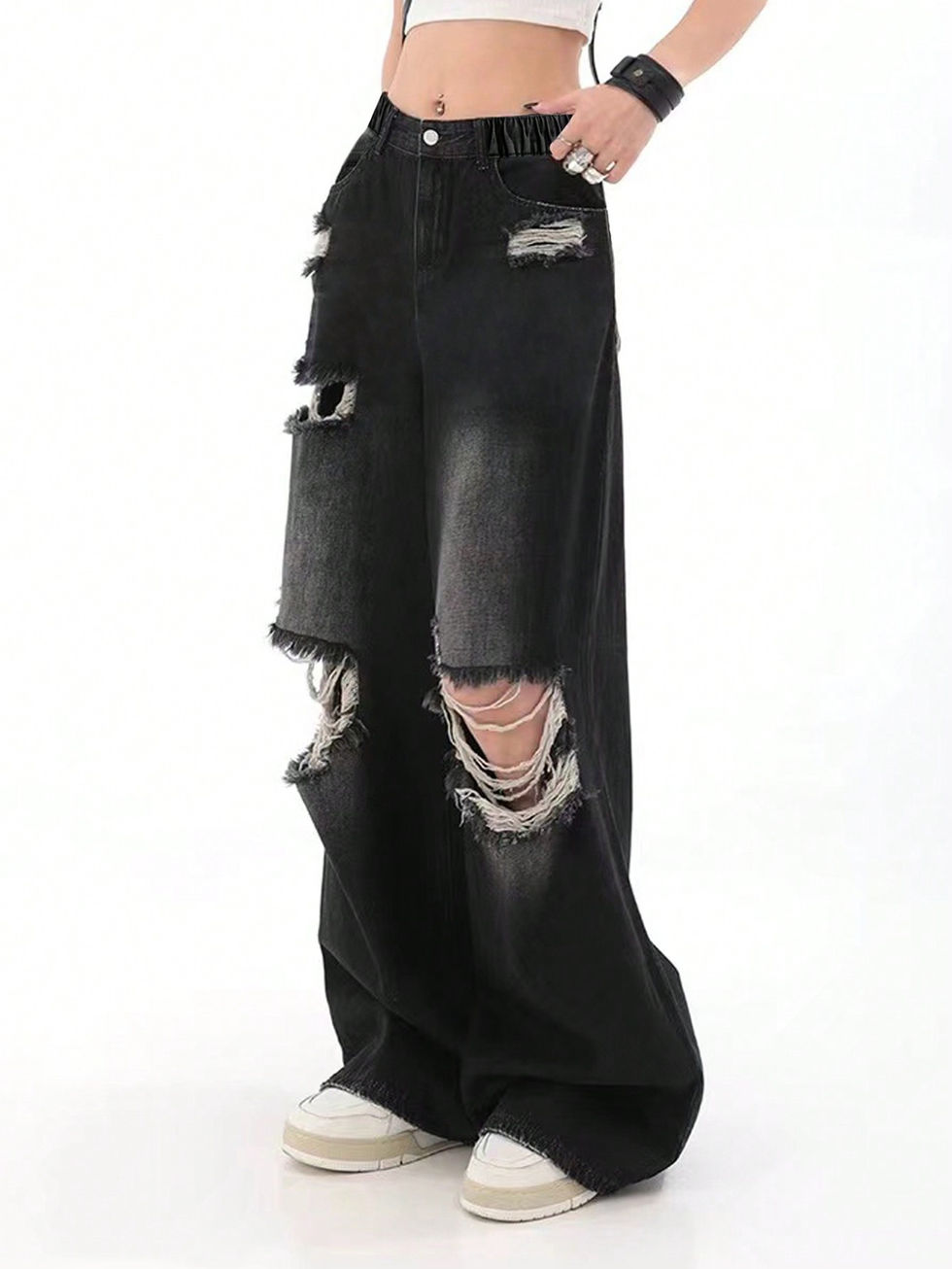 Calça Denim vintage desgastada para adolescente, calça reta de perna larga com