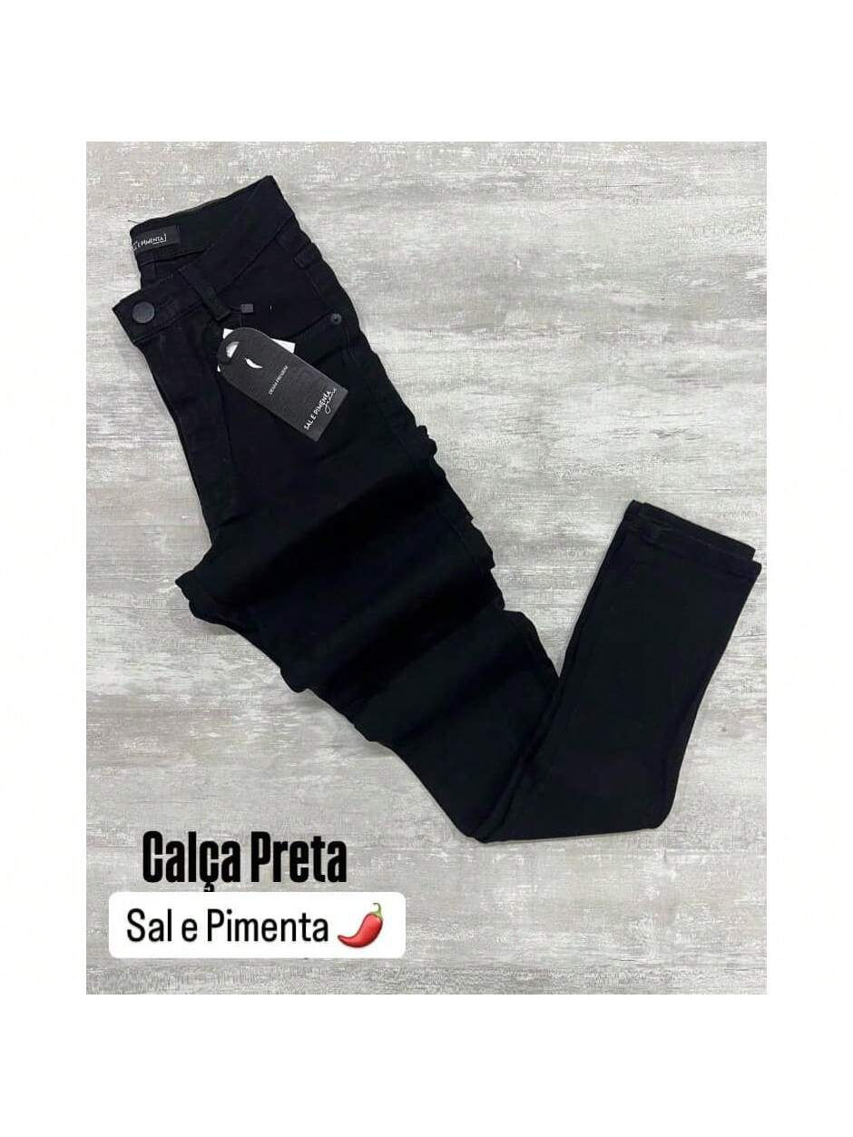 Calça Jeans Sal e Pimenta Preta Com Elastano Cintura Alta Premium Simples Cas
