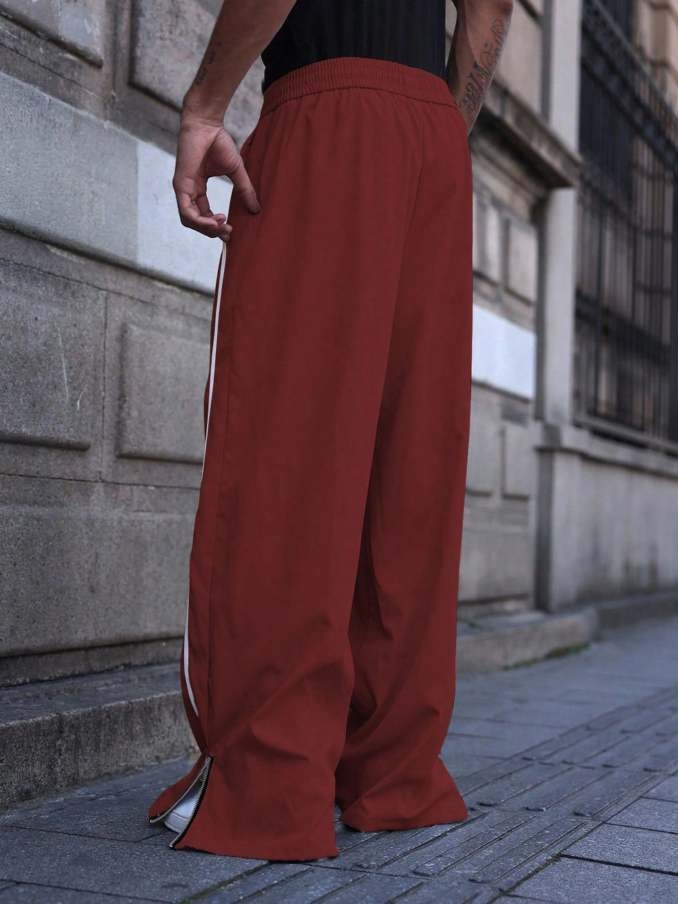 Calça Masculina de Perna Larga com Zíper na Frente, Estampa de Listras Colorida