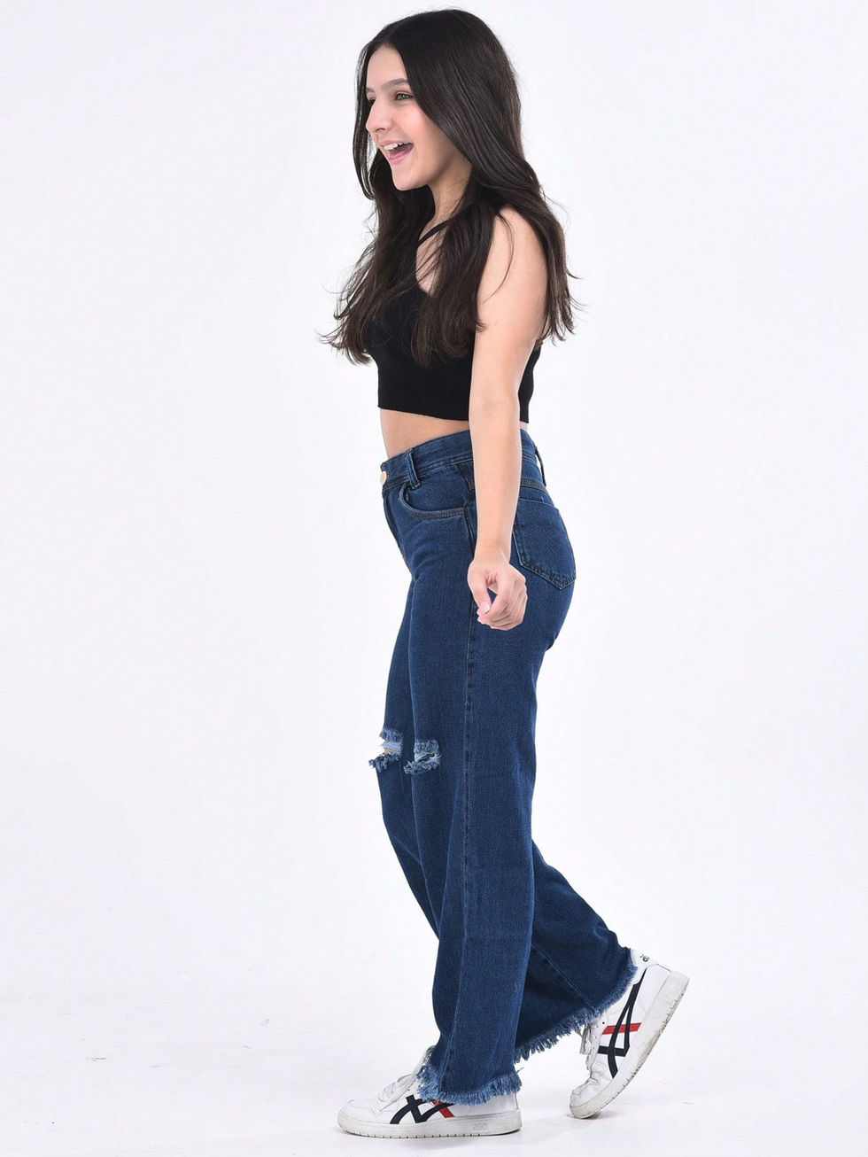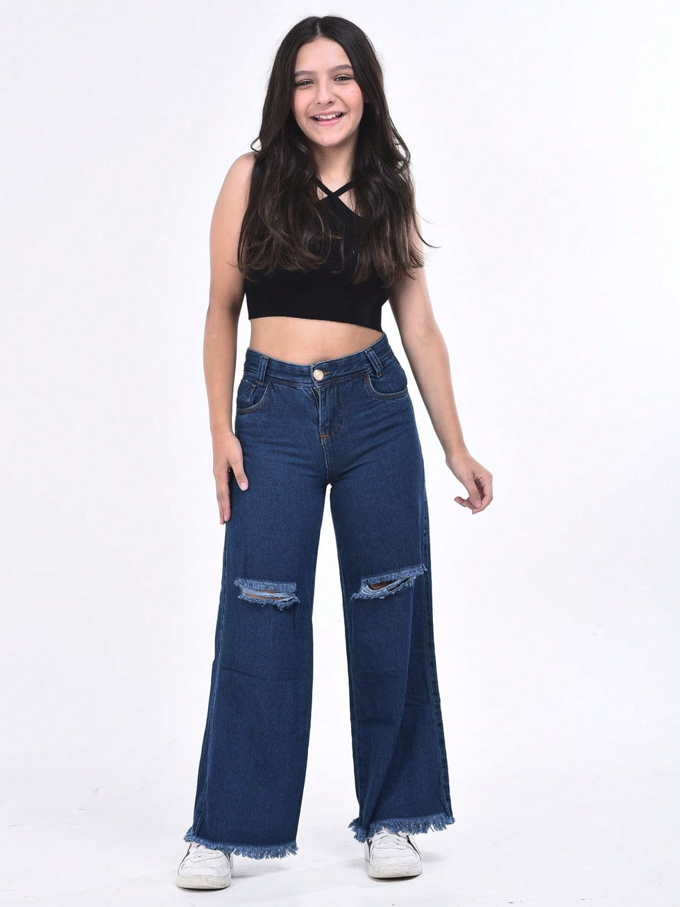 Calça wide leg pantalona jeans infantil juvenil com estampa