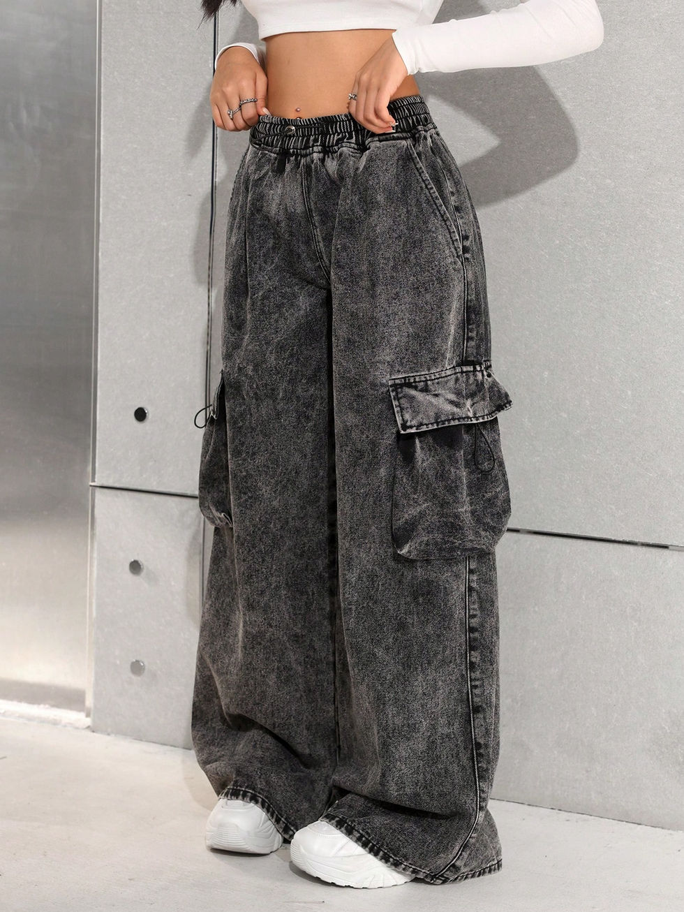 Calças de Carga de Denim Vintage com Cintura Ajustável com Cordão, Pernas Larga