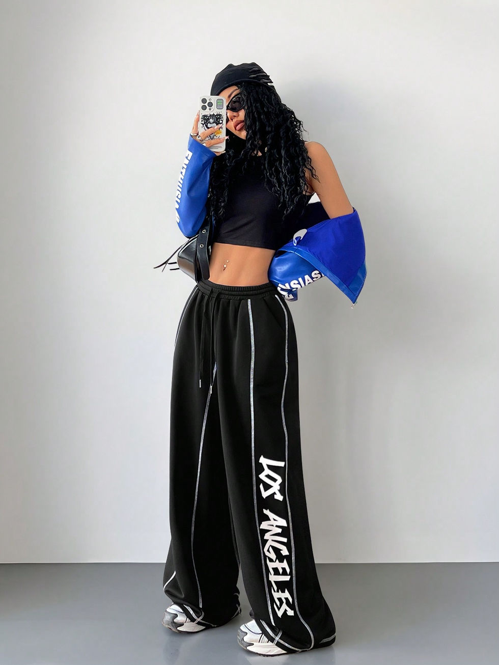 Coolane Calça de Moletom Esportiva de Perna Larga com Gráficos de Tubulação Con