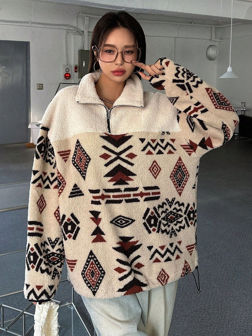 DAZY Blusão com Capuz de Lã Teddy com Padrão Geométrico e Zíper Parcial para Mu