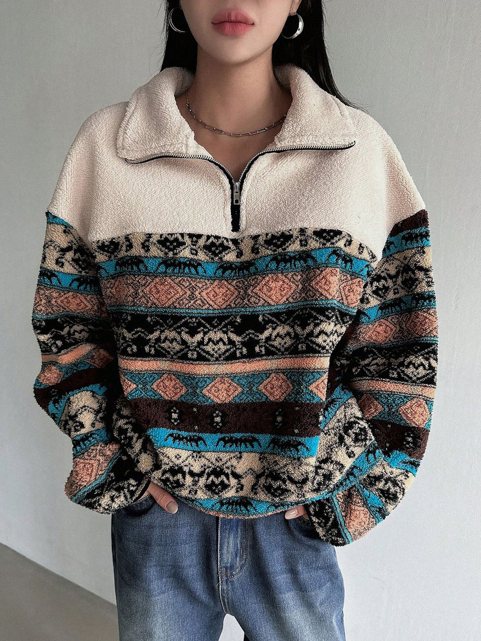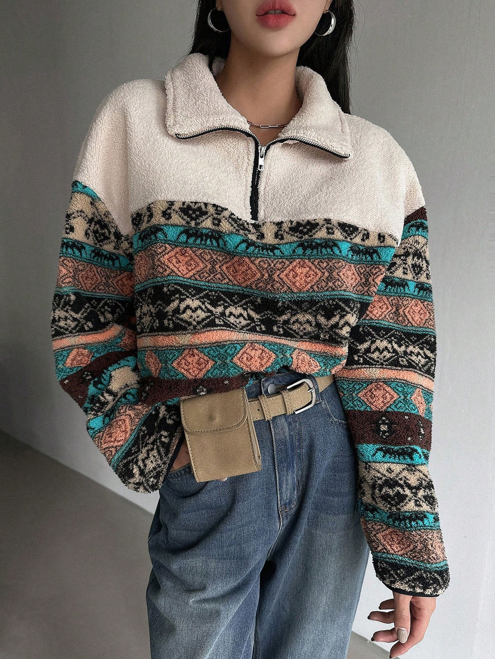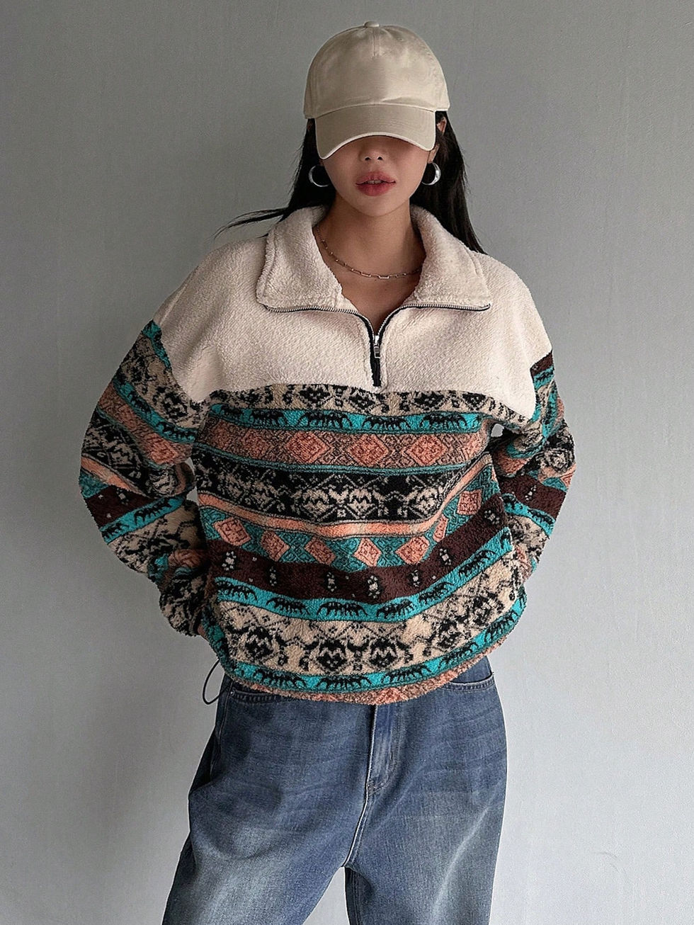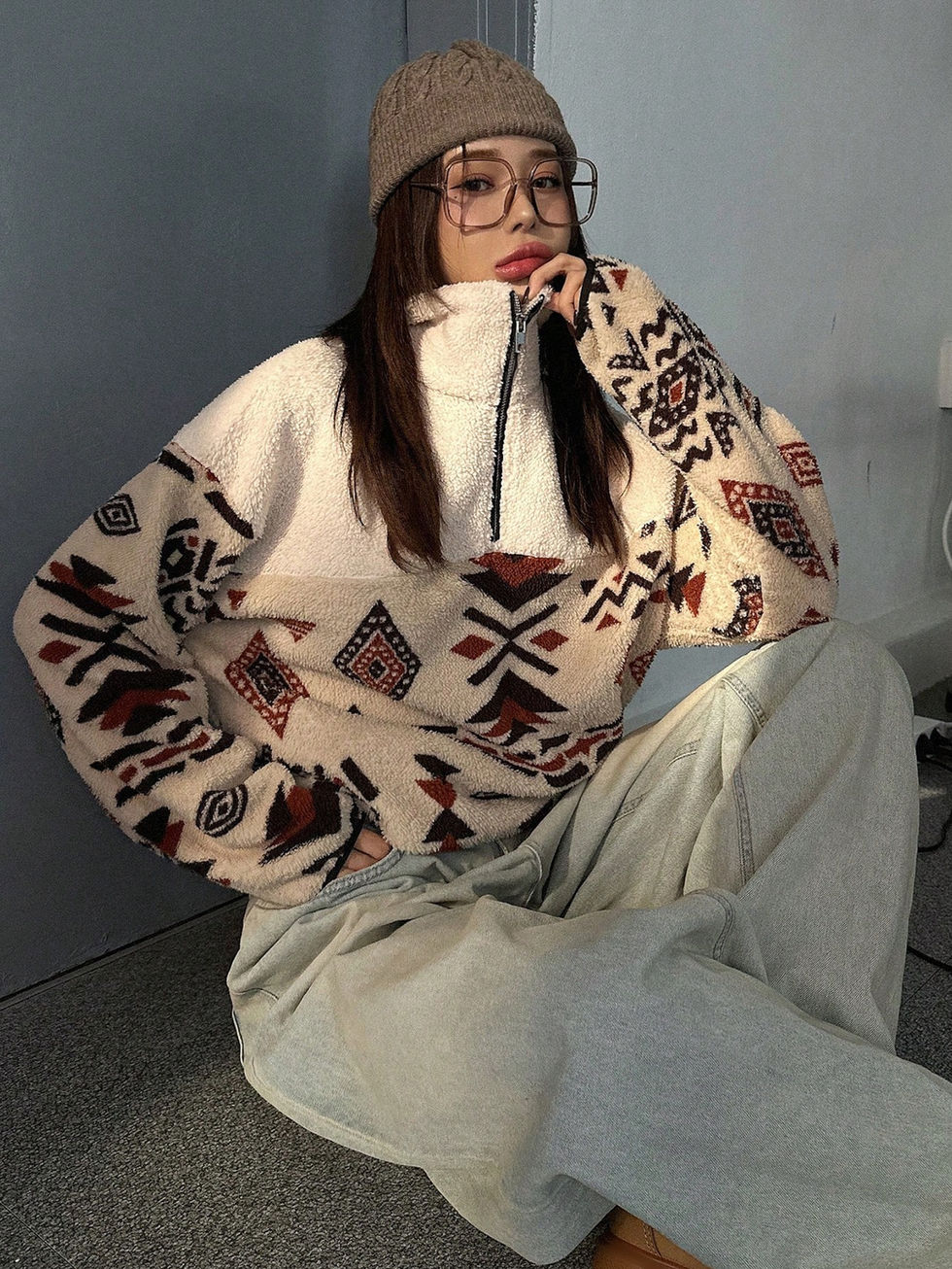 DAZY Impressão Geográfica Meio Zíper Ombro Caído Moletom
