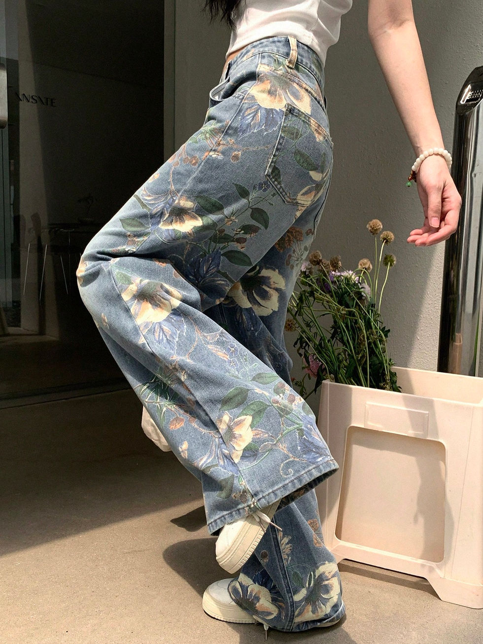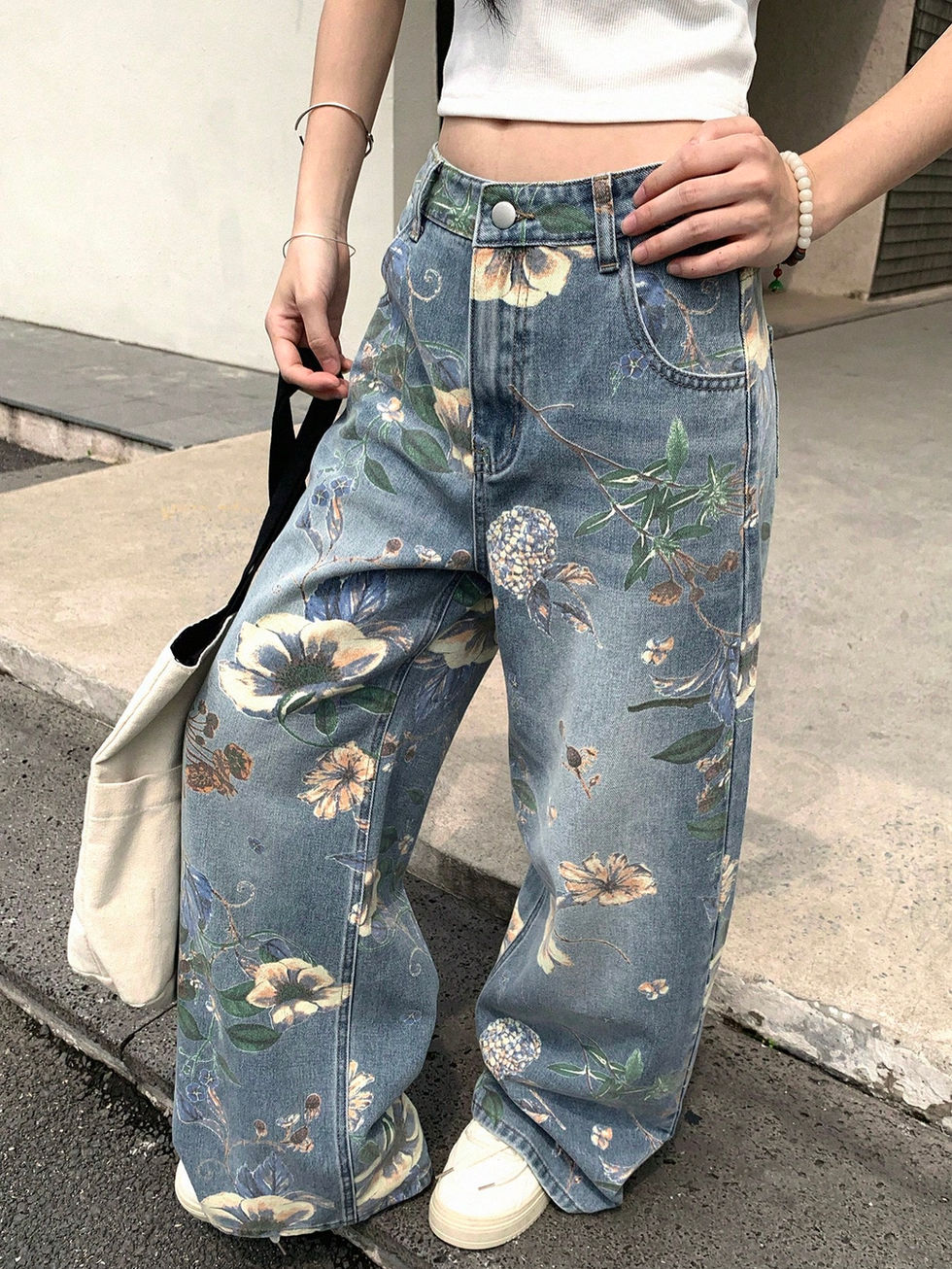 DAZY Jeans Feminino Wide-Leg (Perna Larga) Lavado com Estampa Floral Completa
