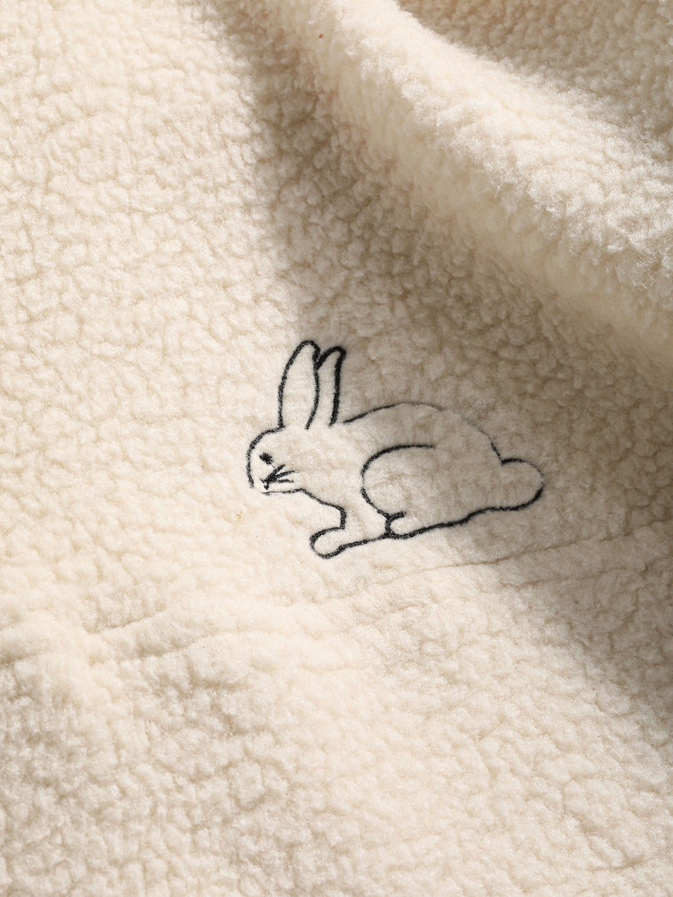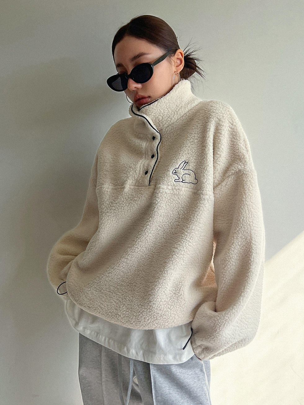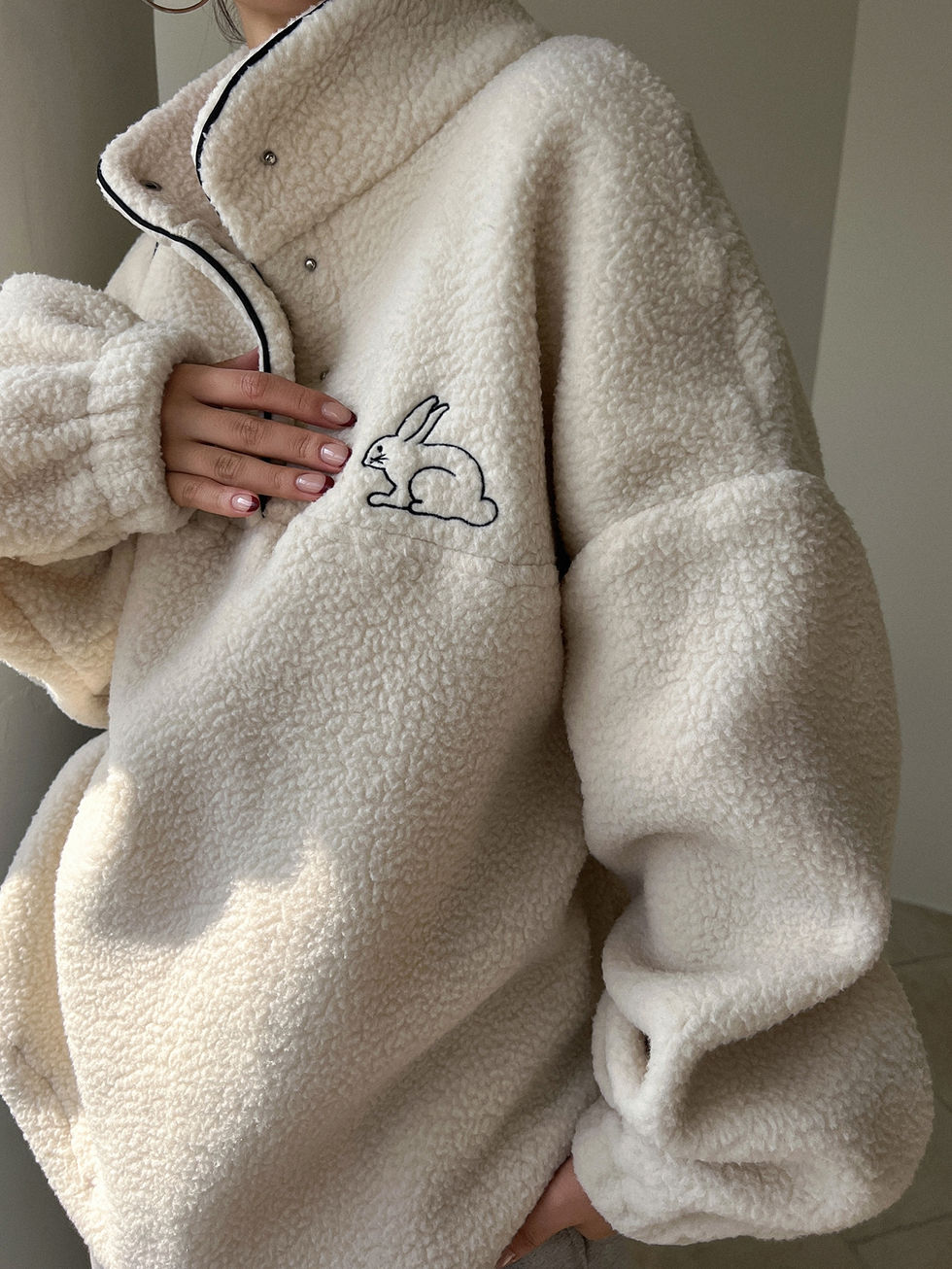 DAZY Moletom Teddy de Ombro Caído com Bordado de Coelho e Meio Botão, Blusas de