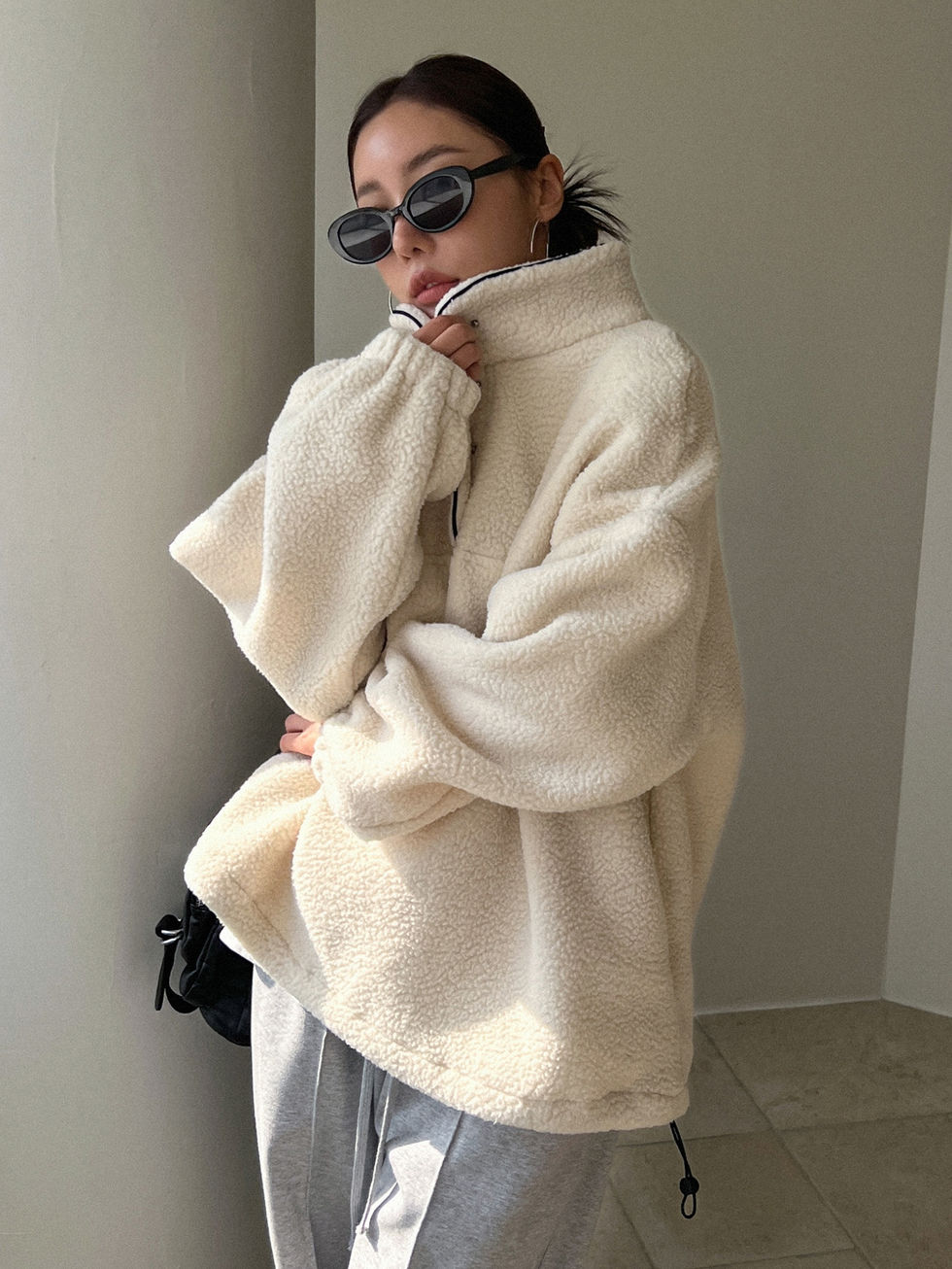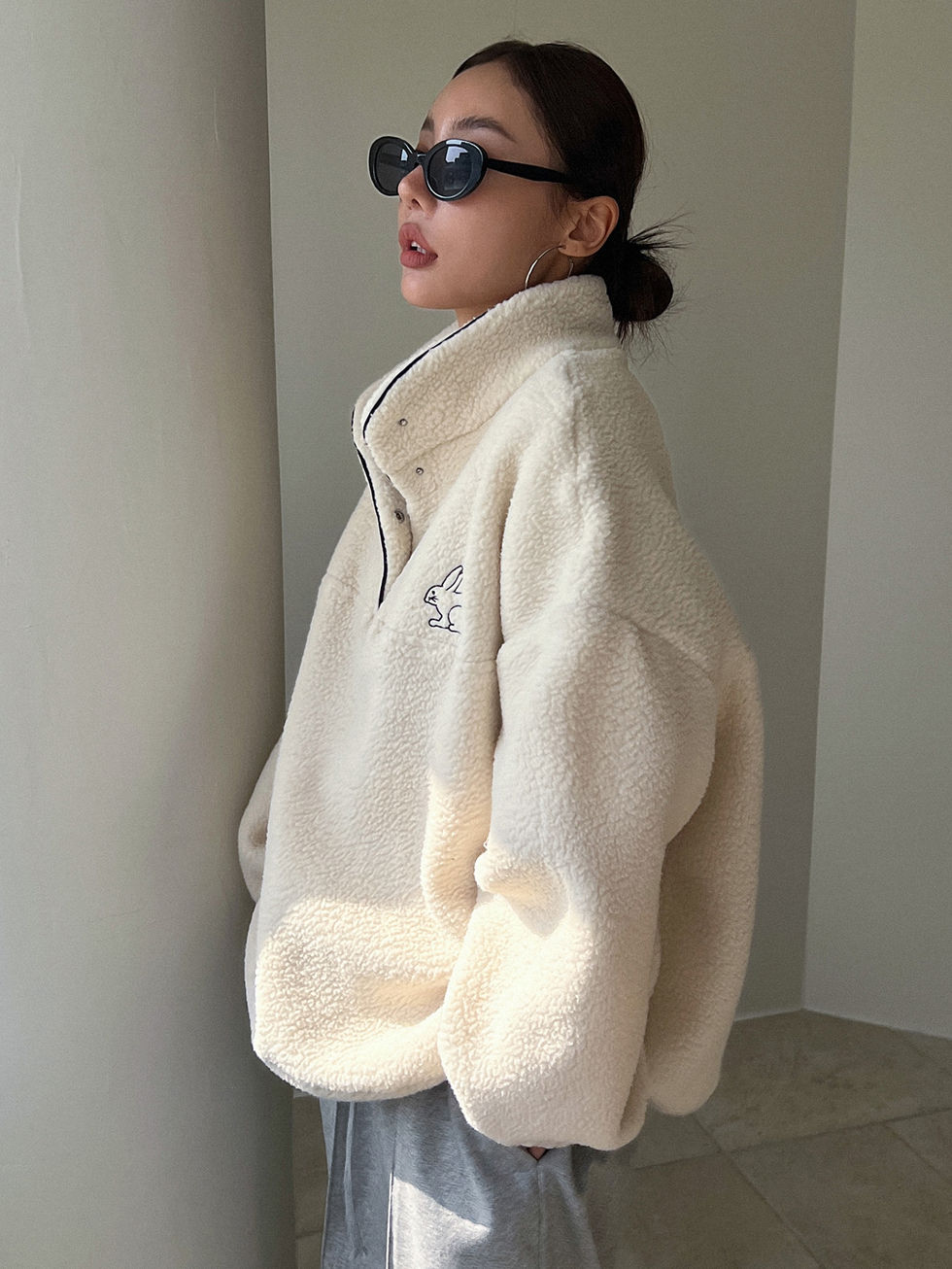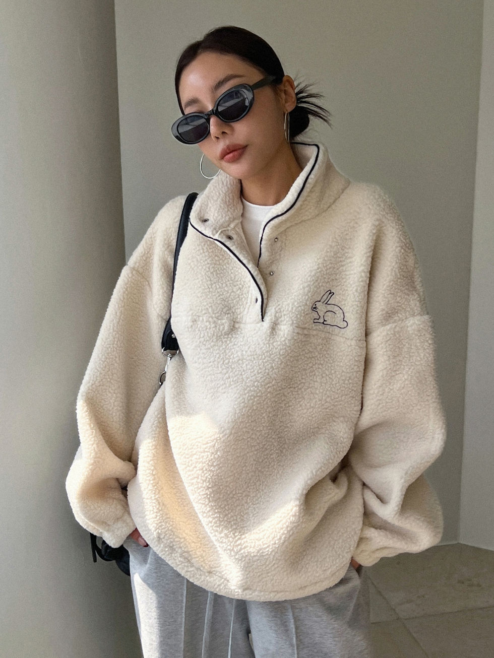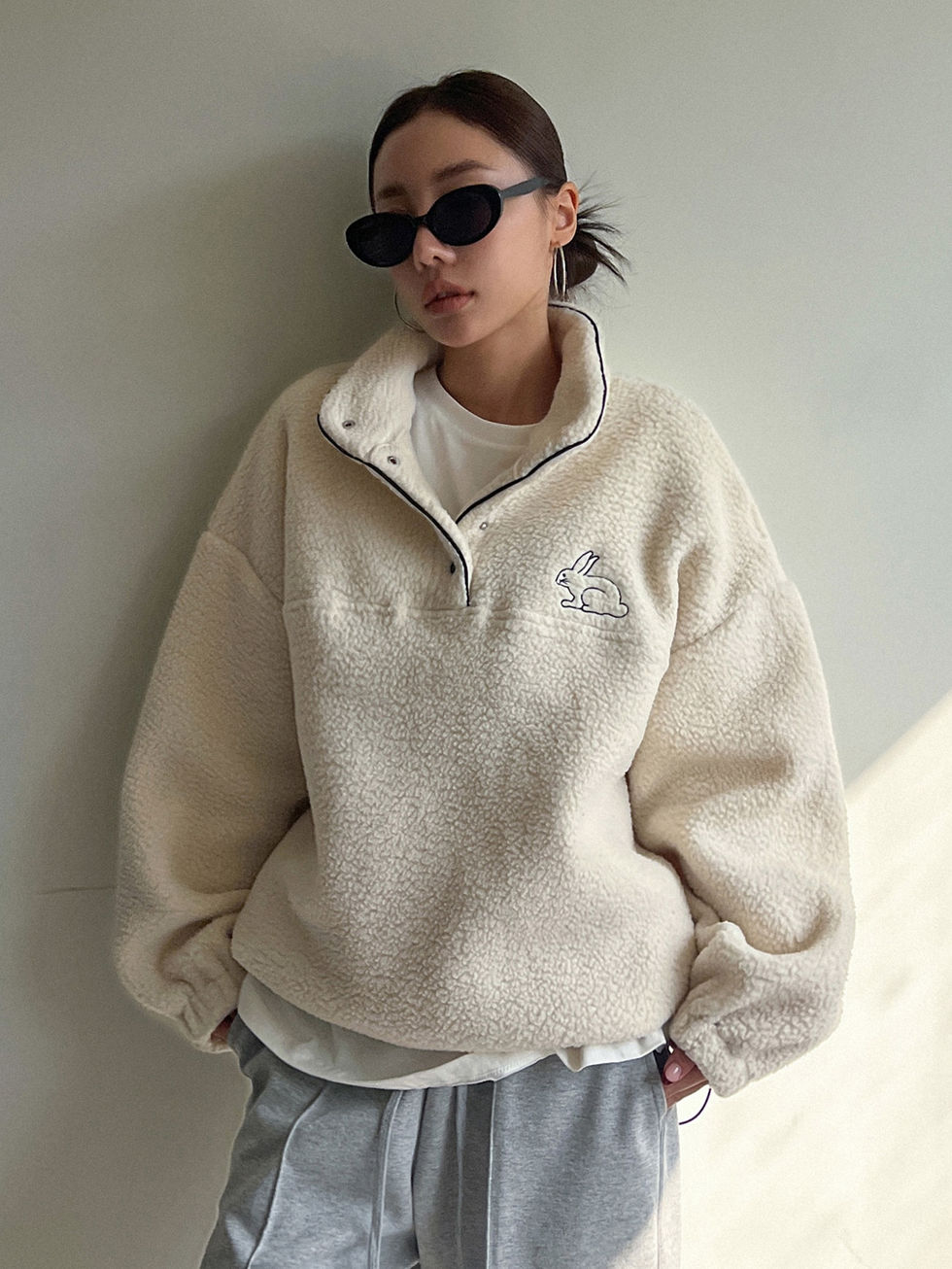 DAZY Moletom Teddy de Ombro Caído com Bordado de Coelho e Meio Botão, Blusas de