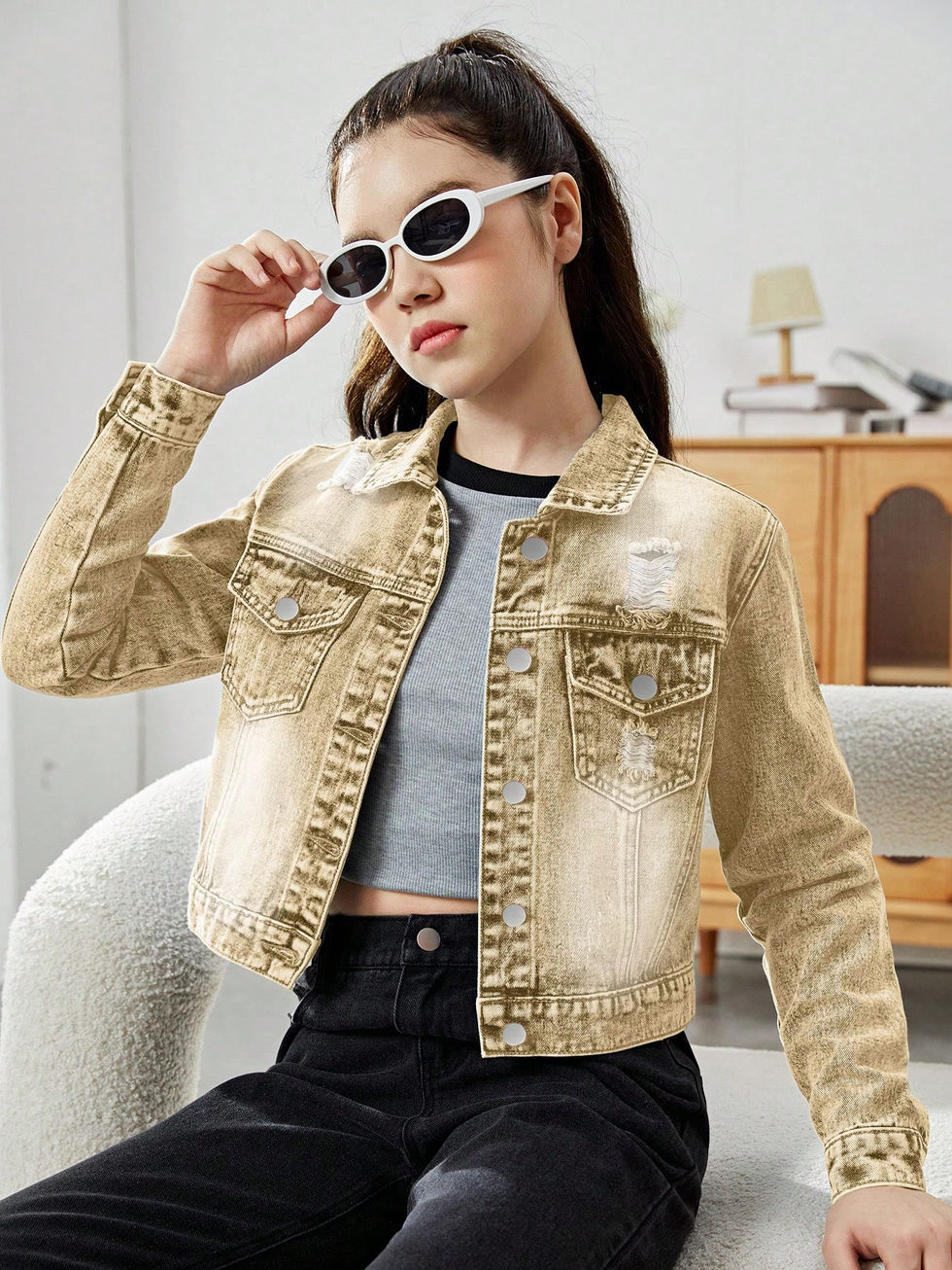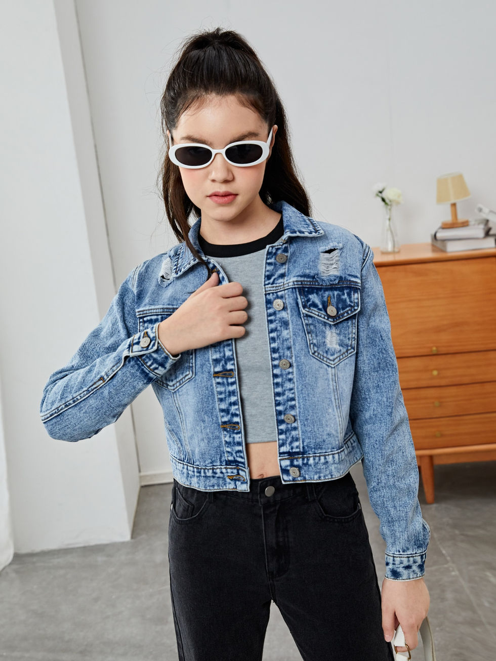 Garotas Adolescentes Jaqueta jeans Rasgado Bolso com aba