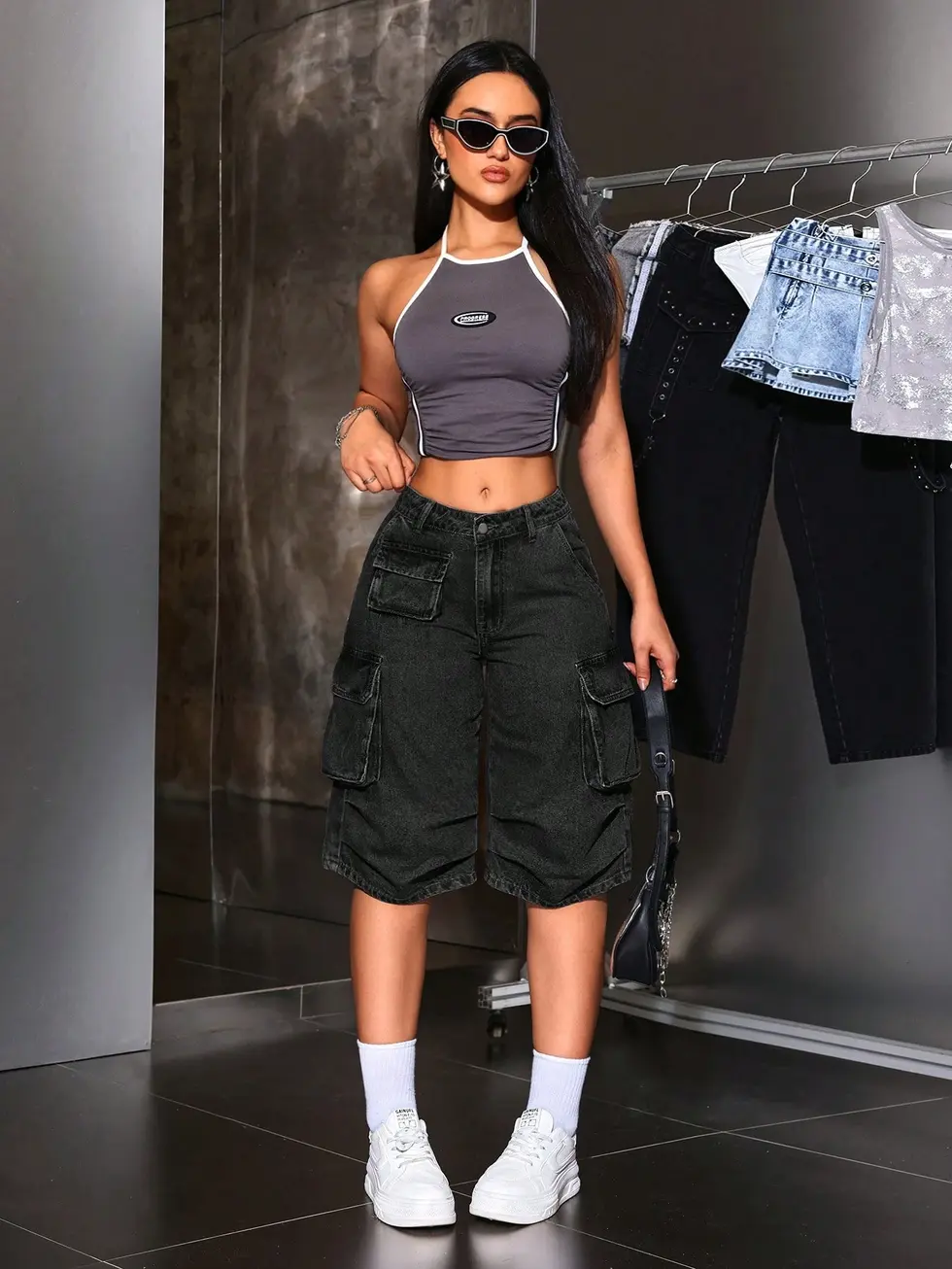 ICON Shorts Denim Casuais Femininos com Bolsos e Botões na Frente, Uso Diário