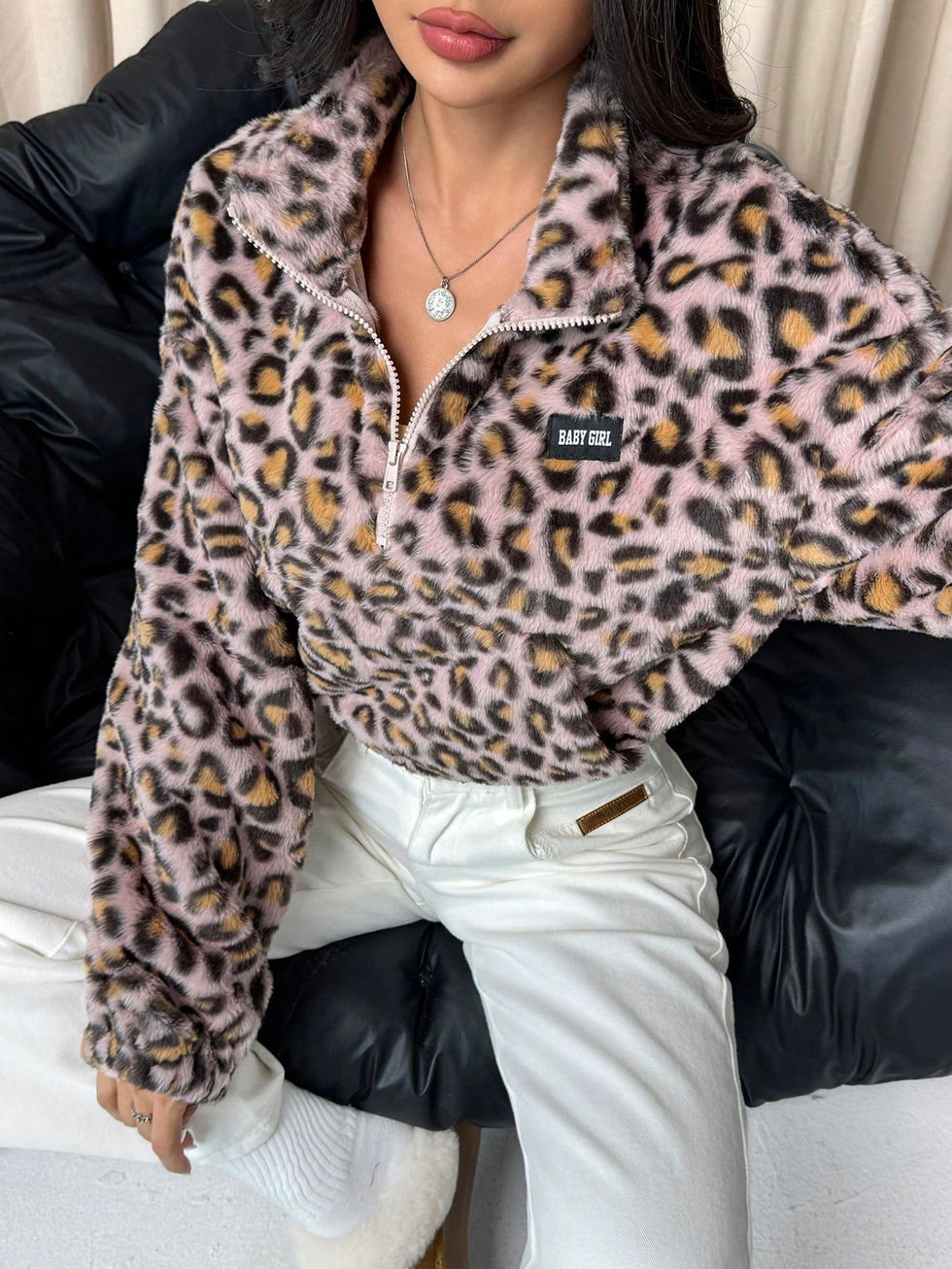 Jaqueta com Capuz de Zíper e Forro Fleece com Estampa de Onça para Mulheres, Bl