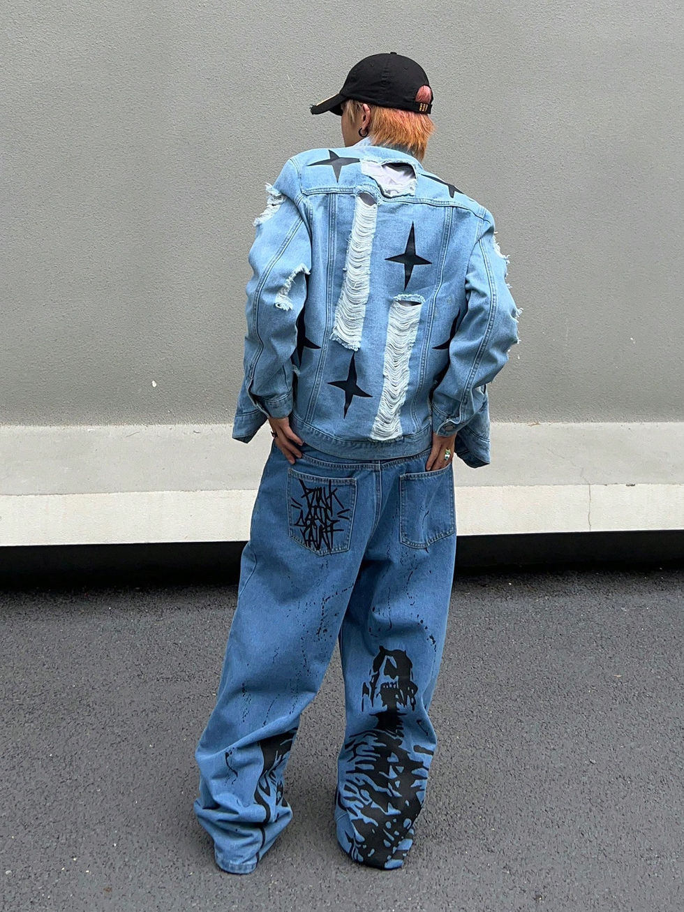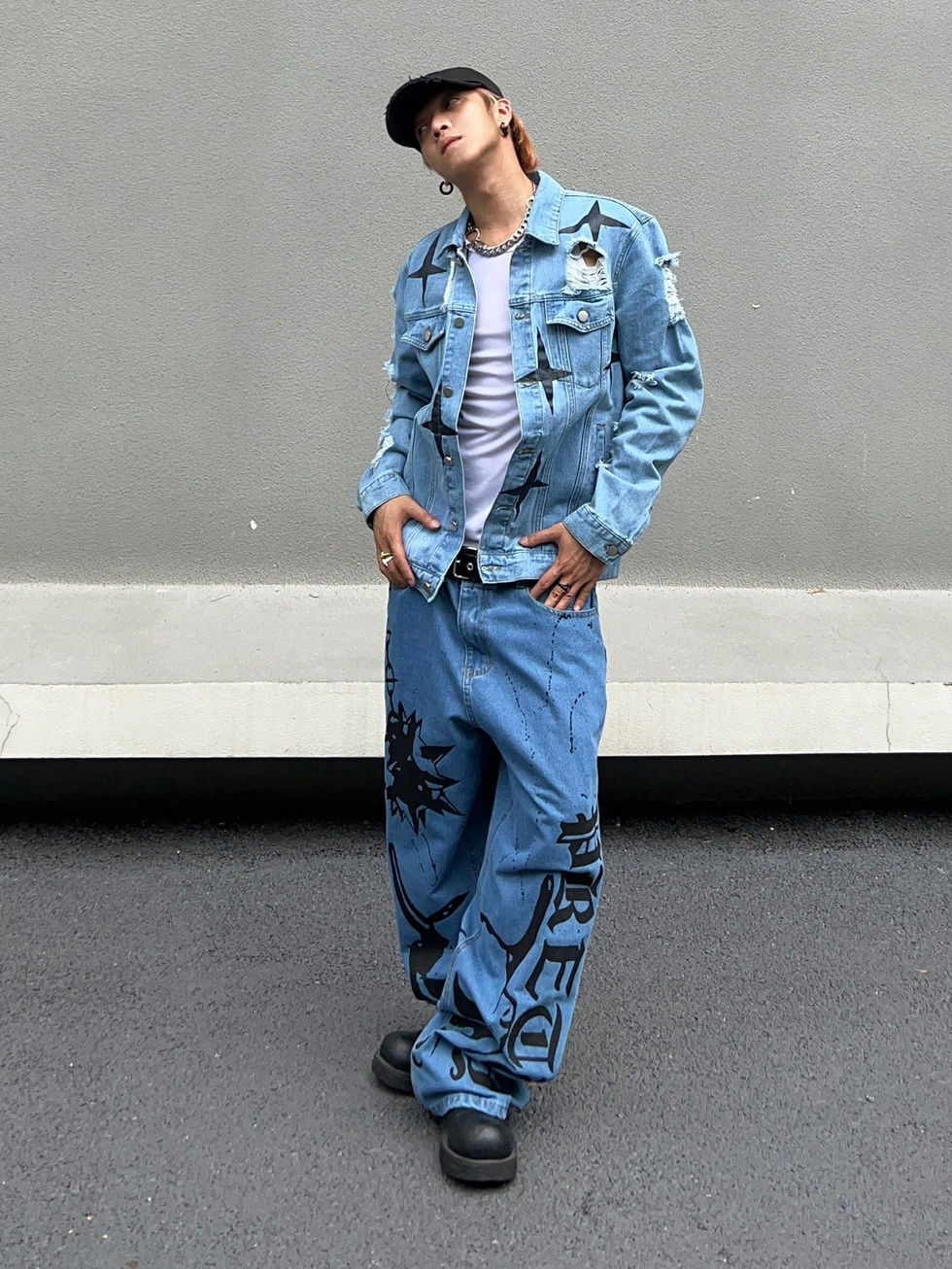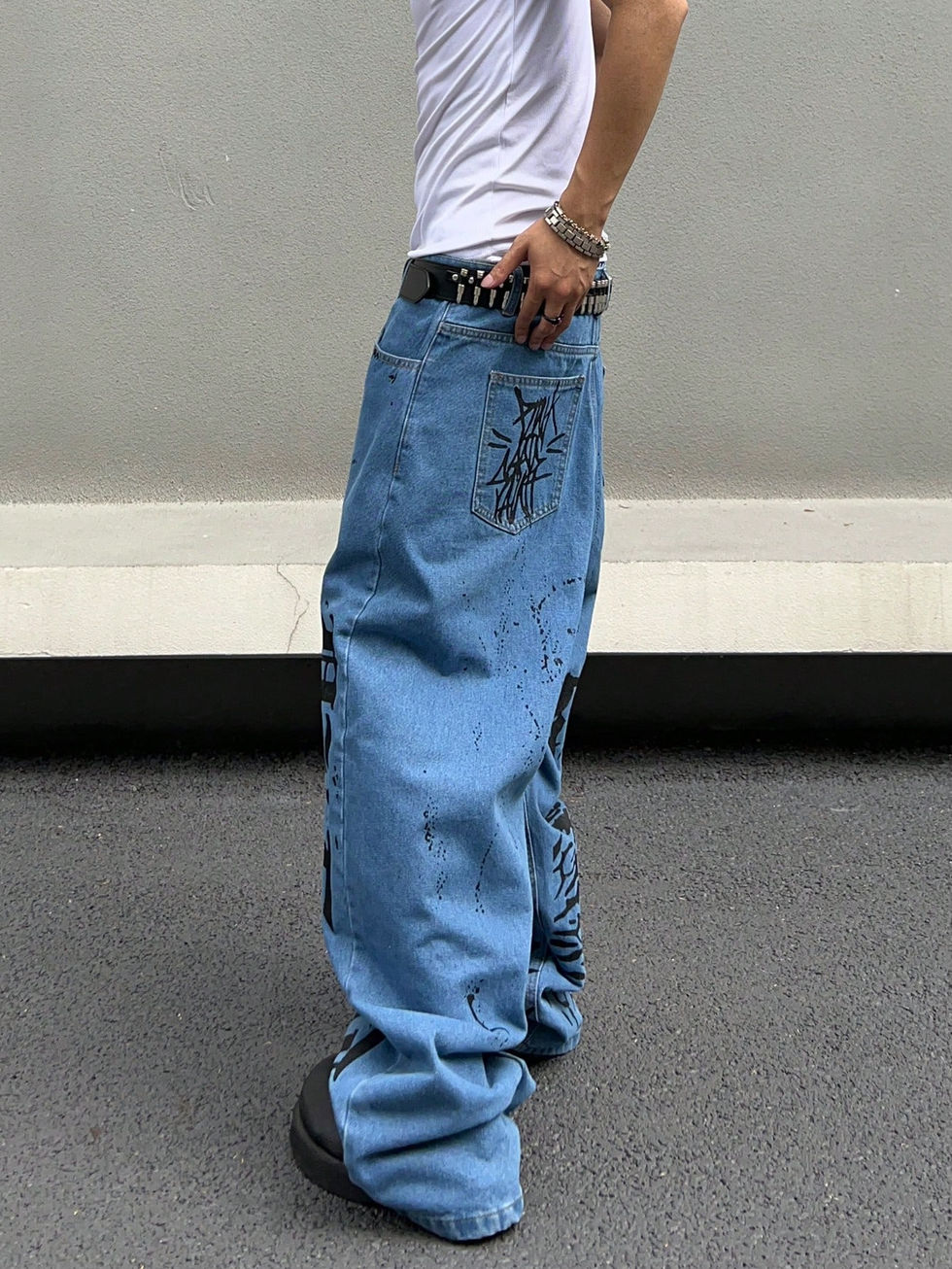 Manfinity EMRG Denim de Perna Larga com Gráfico de Letra Masculino, Denim de Pe