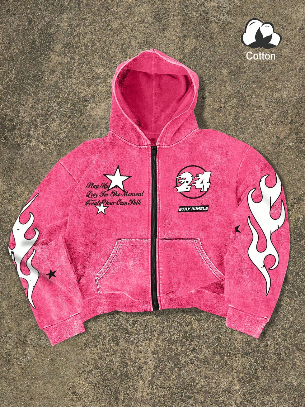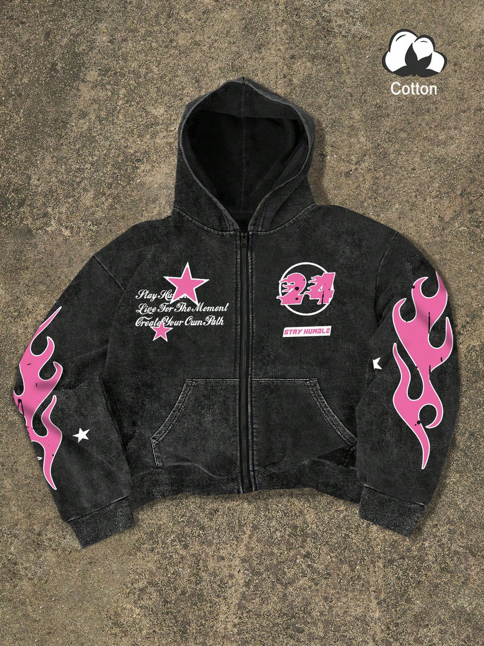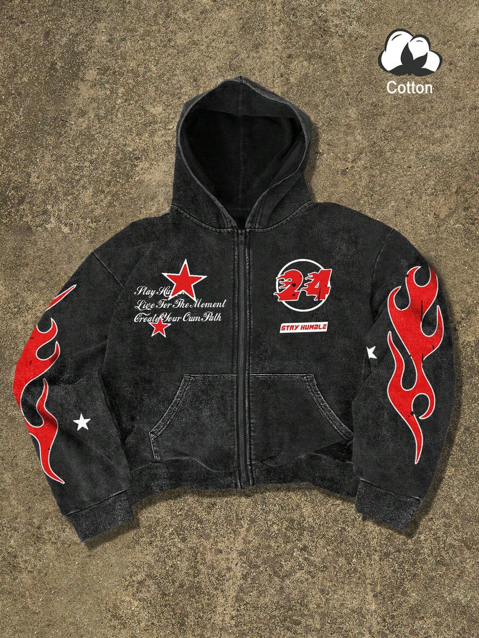 Detalhes: Estampa frontal de chamas, capuz com cordão ajustável, bolsos frontais tipo canguru, punhos e barra canelados