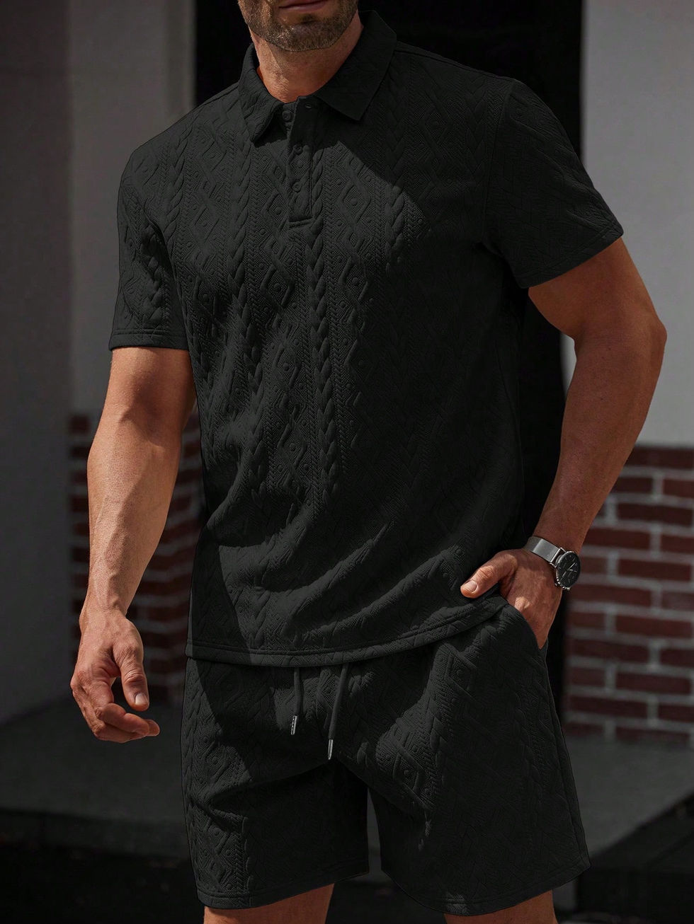 Manfinity Homme Camisa Polo de Manga Curta e Shorts Casuais com Textura Geométr