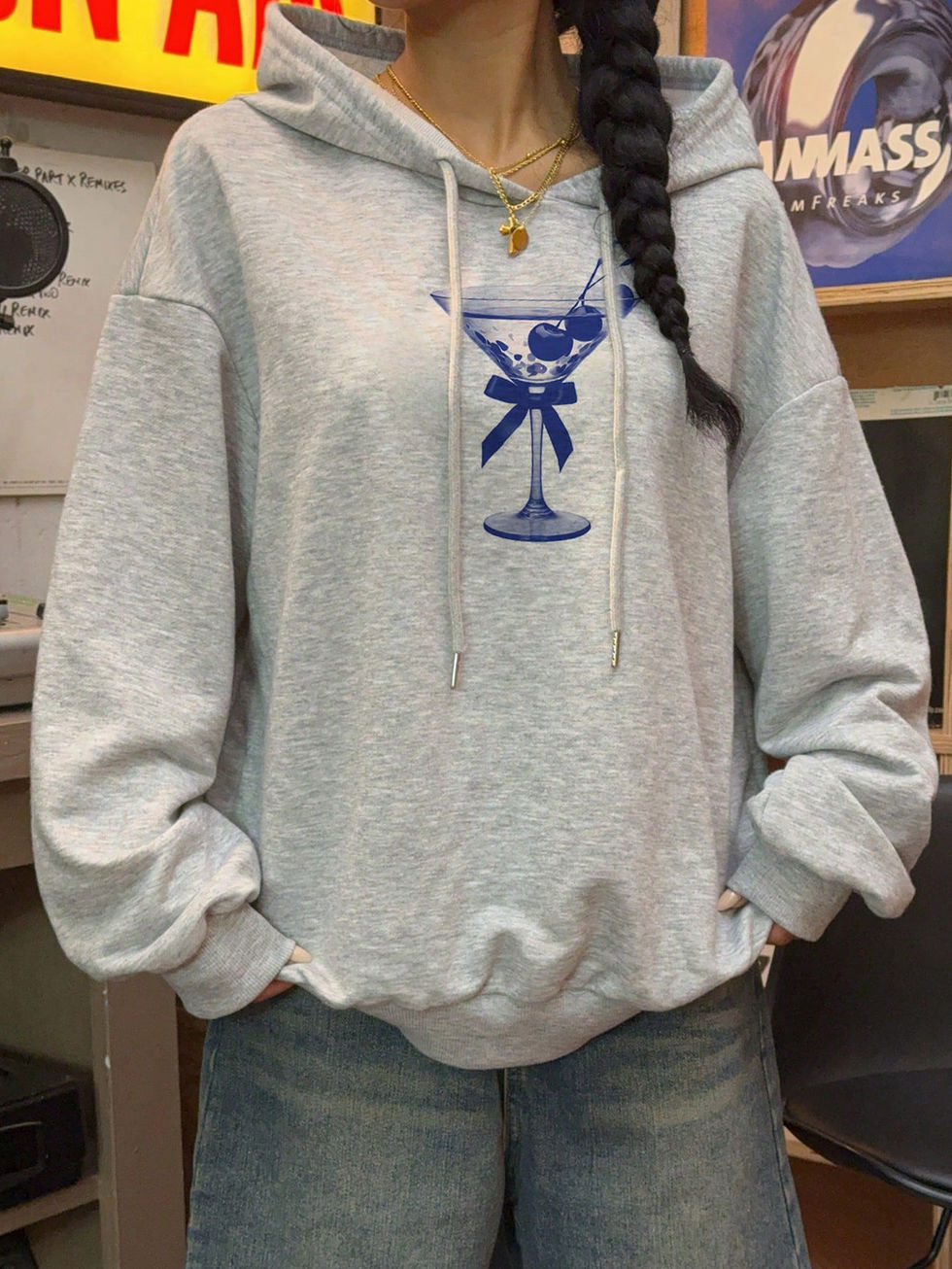 Moletom Casual Simples com Capuz e Cordão, Estampa de Copo de Coqueijo de Cerej