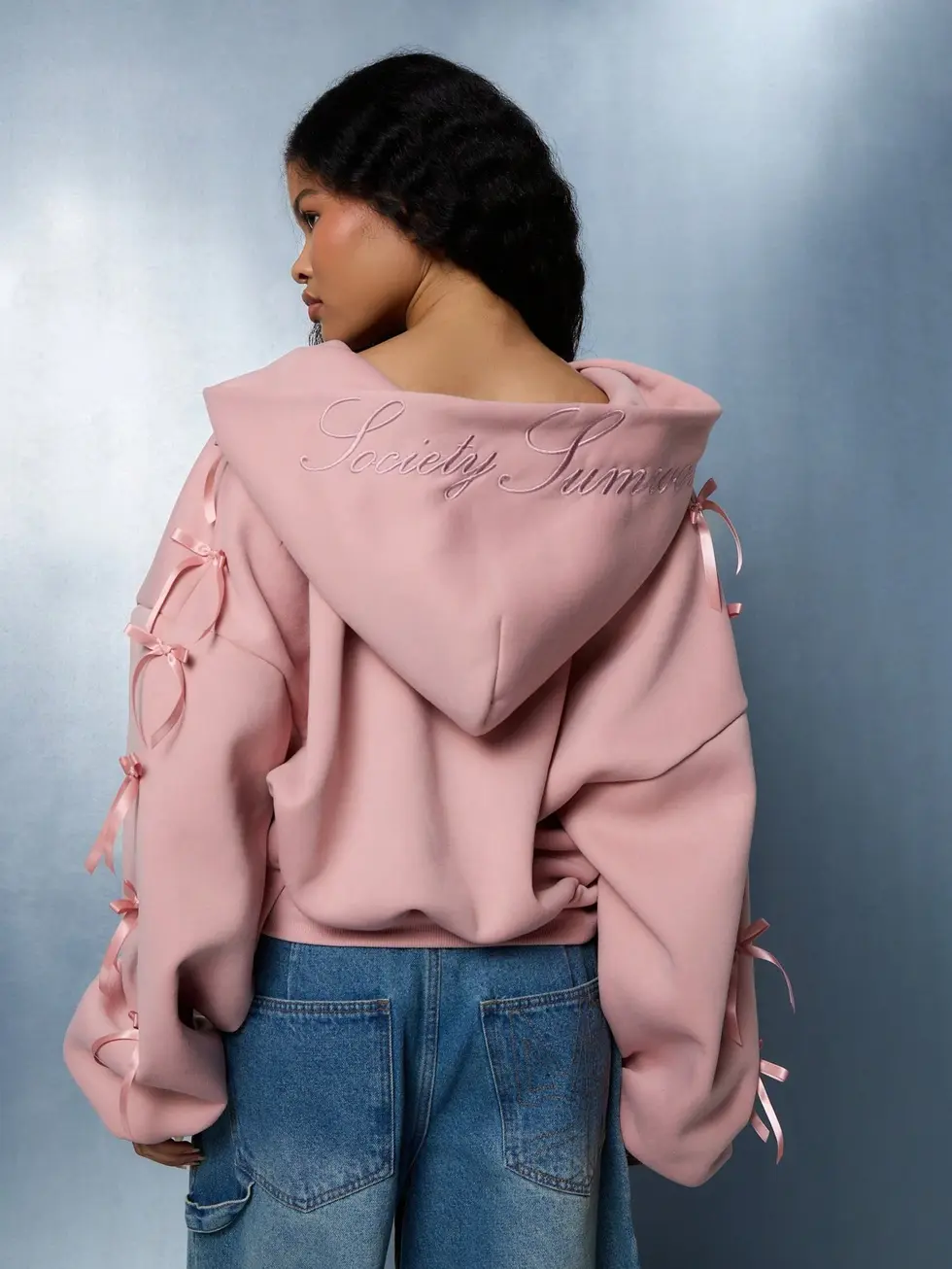 Moletom Cropped com Capuz de Verão da Society, Mangas com Fitas, Logo Bordado,