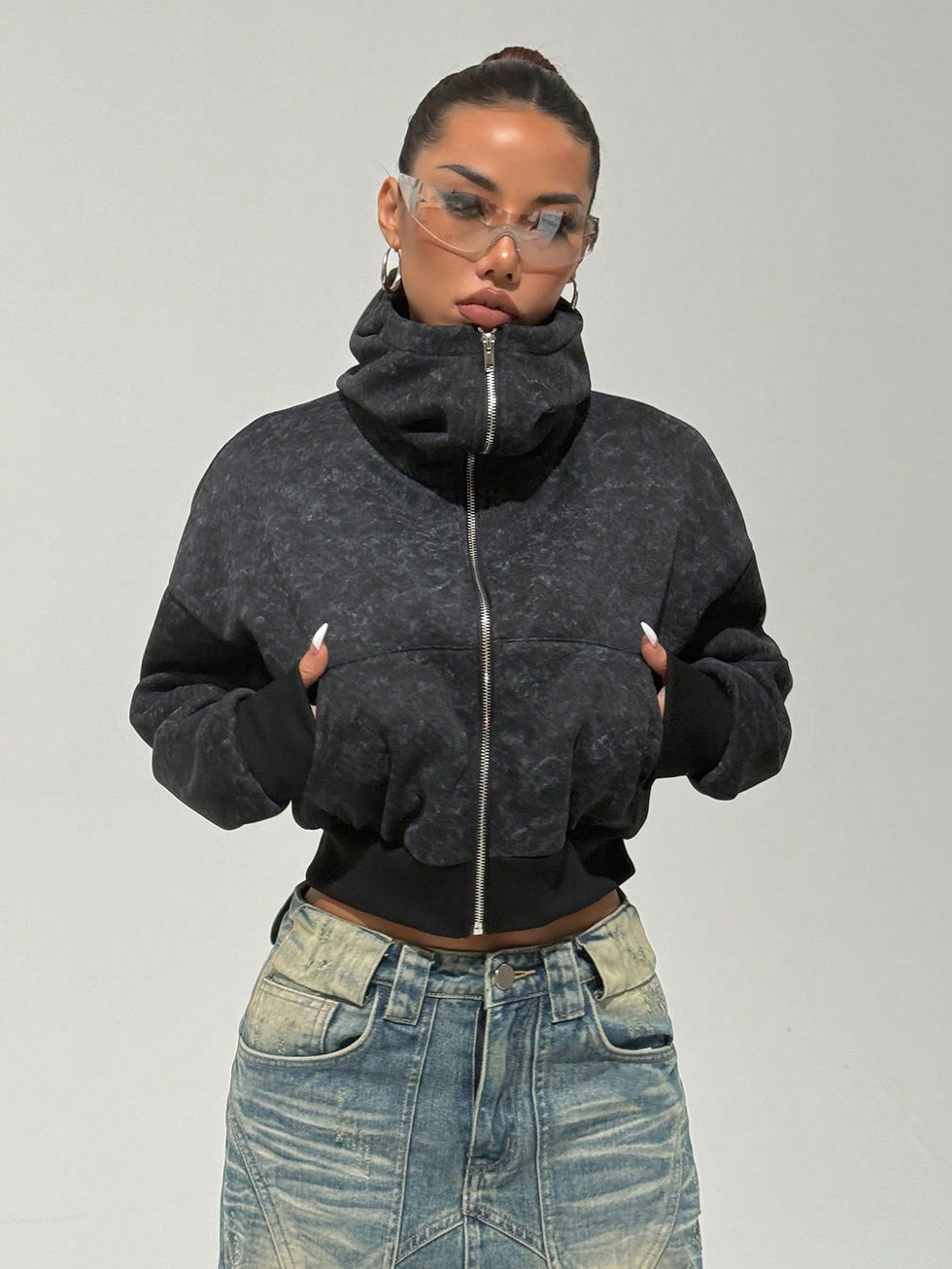 Moletom Feminino de Estilo de Rua com Gola Alta e Abertura Frontal, Feito de Te