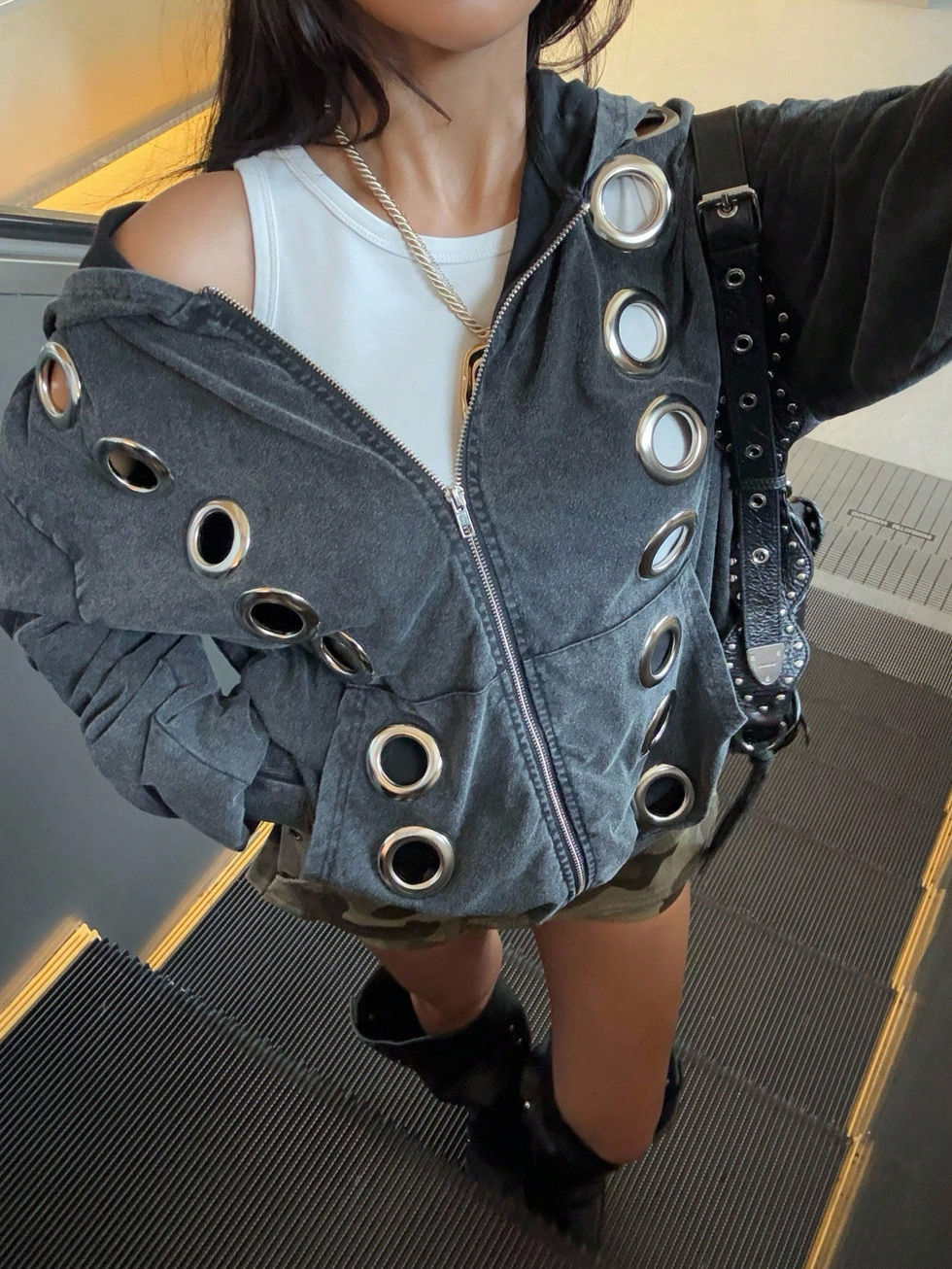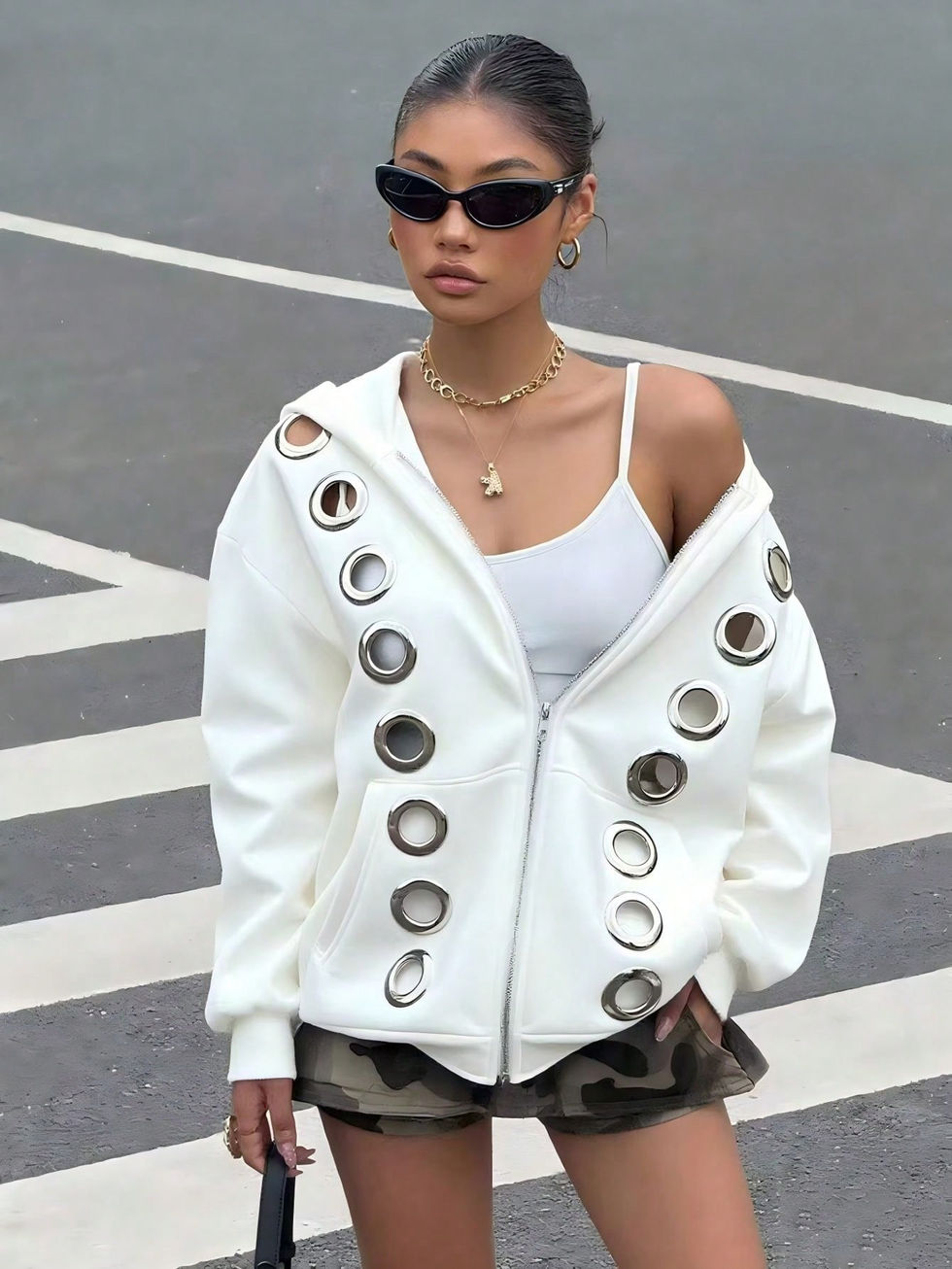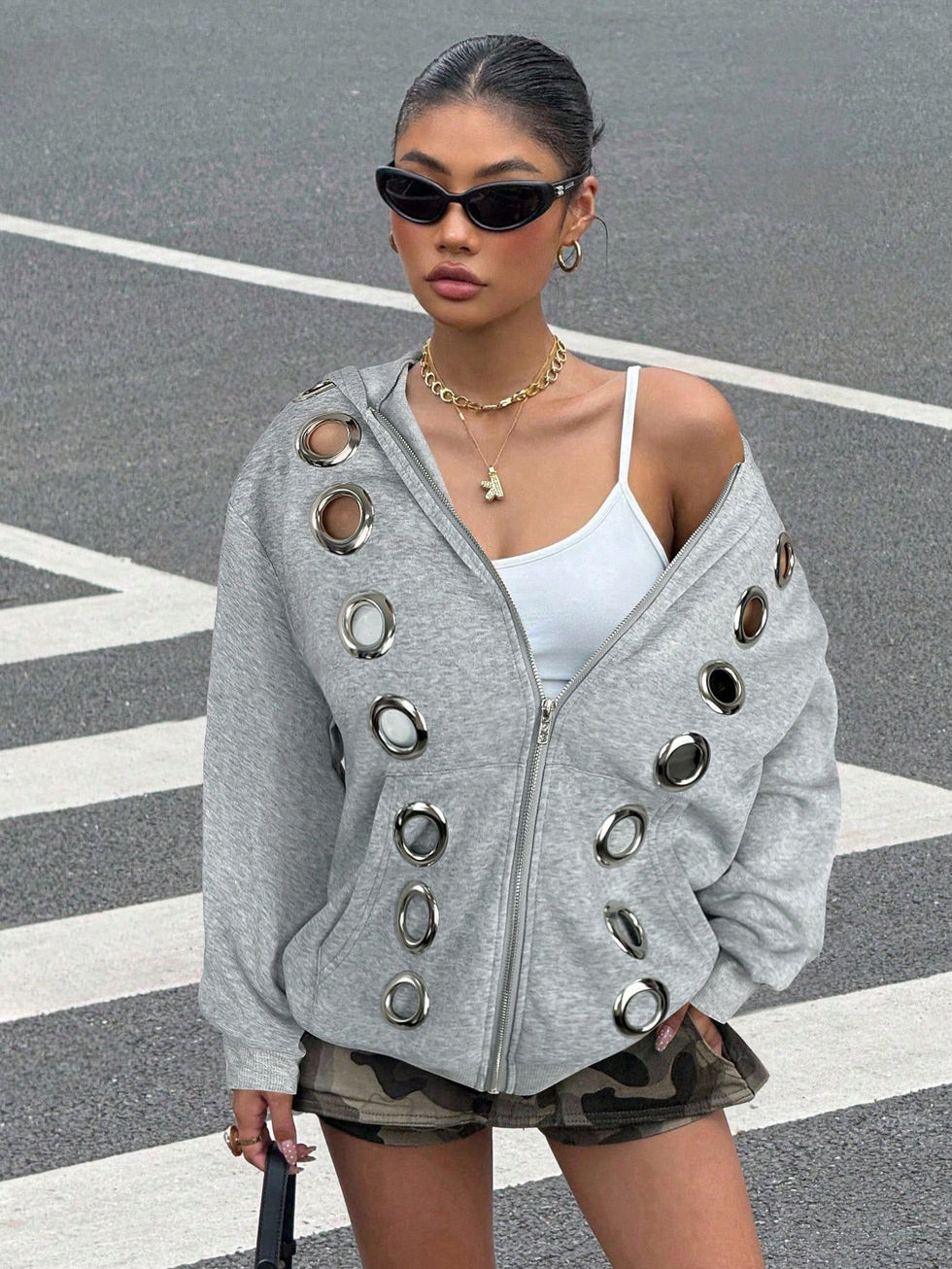 Muchica Moletom com Capuz Preto Casual Feminino com Zíper e Ilhós de Metal, Out