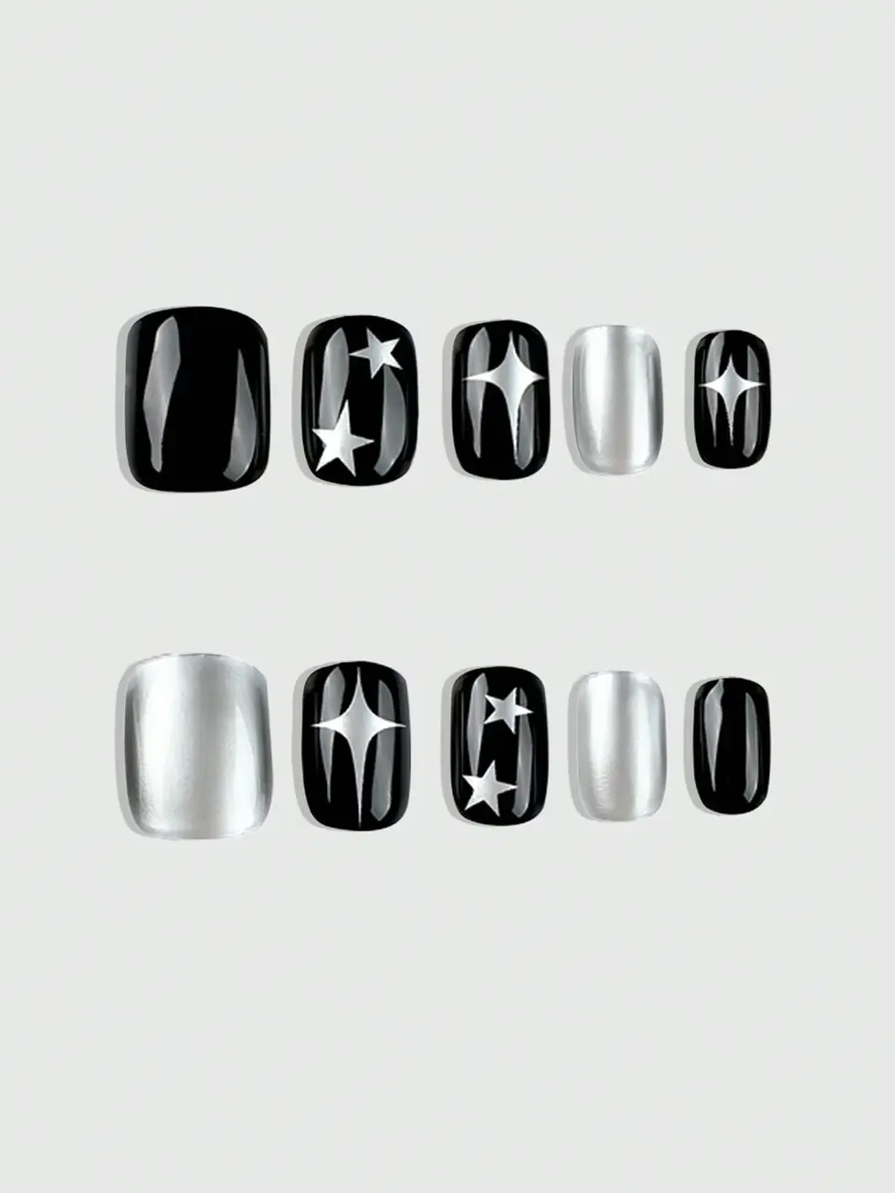 ROMWE Goth 24 Peças Curto Quadrado Padrão De Estrela Bloco De Cores Unha Falsa