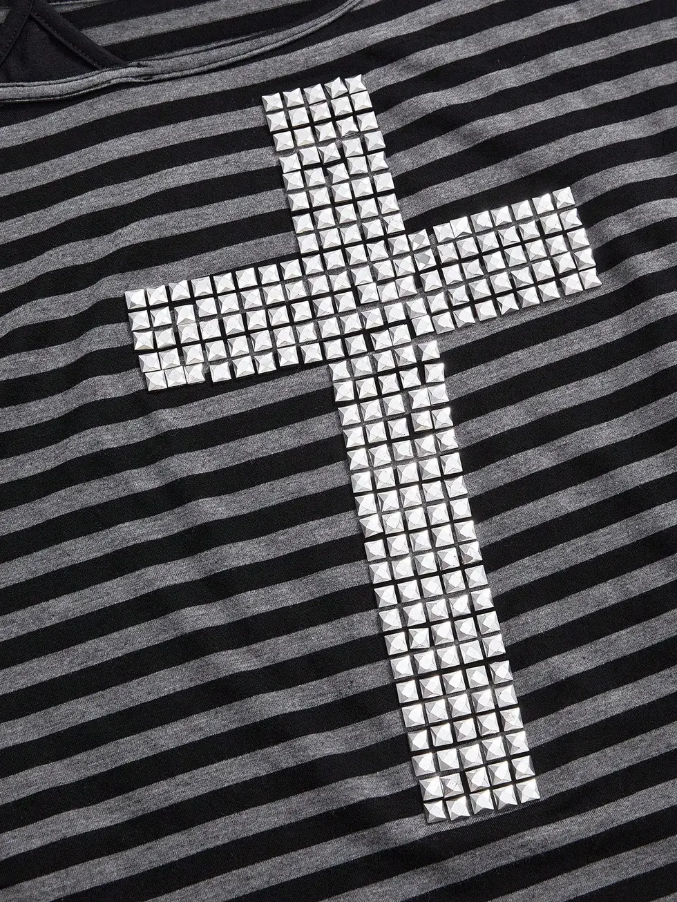 ROMWE J-Fashion Camiseta Básica Vintage Listrada Preta e Cinza com Gráfico Deco