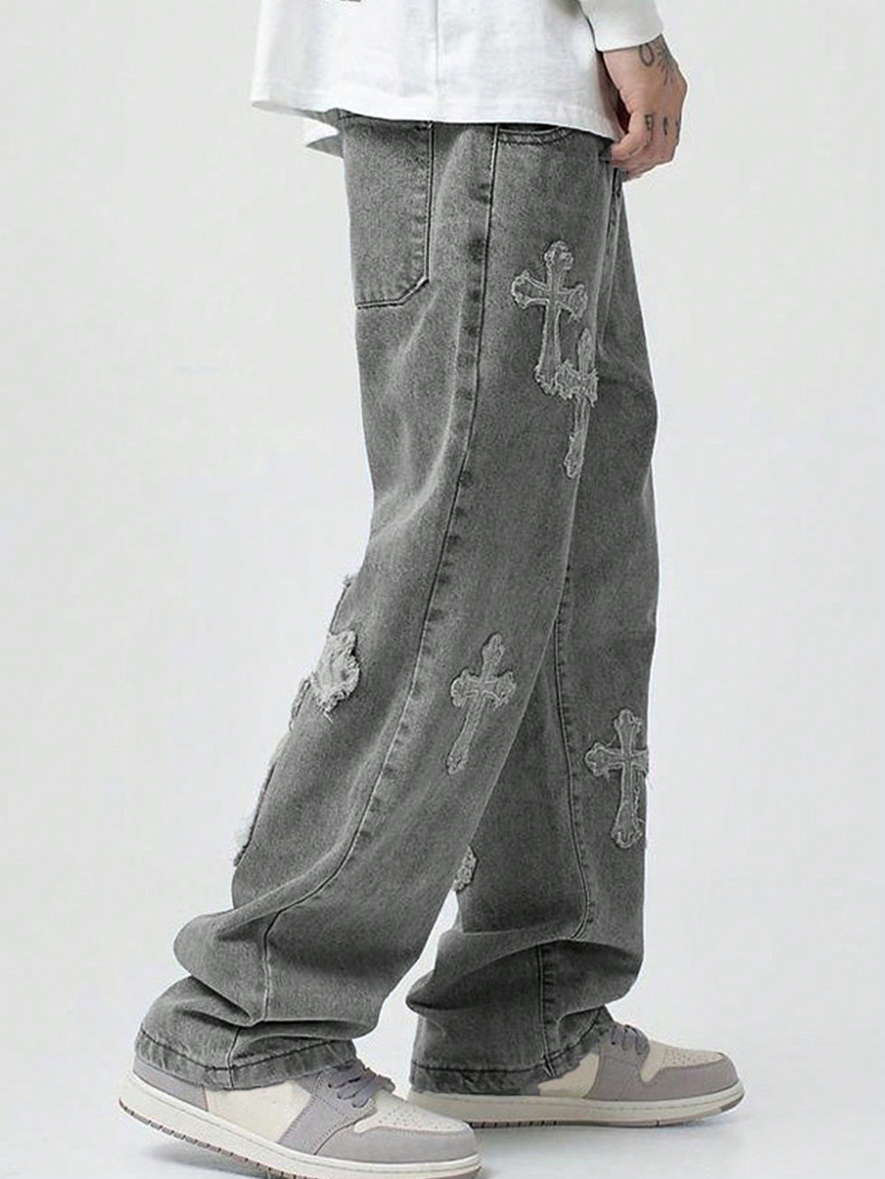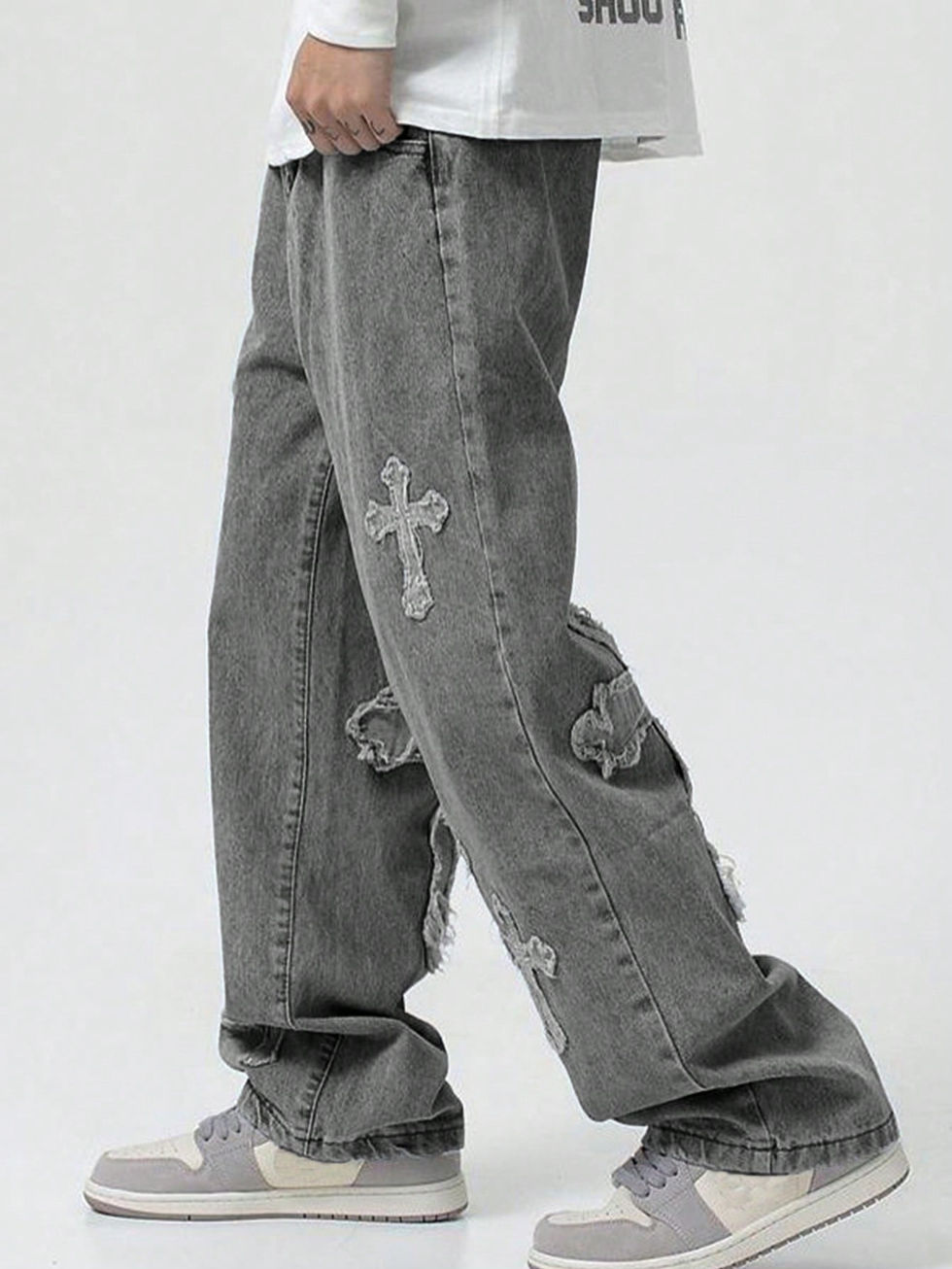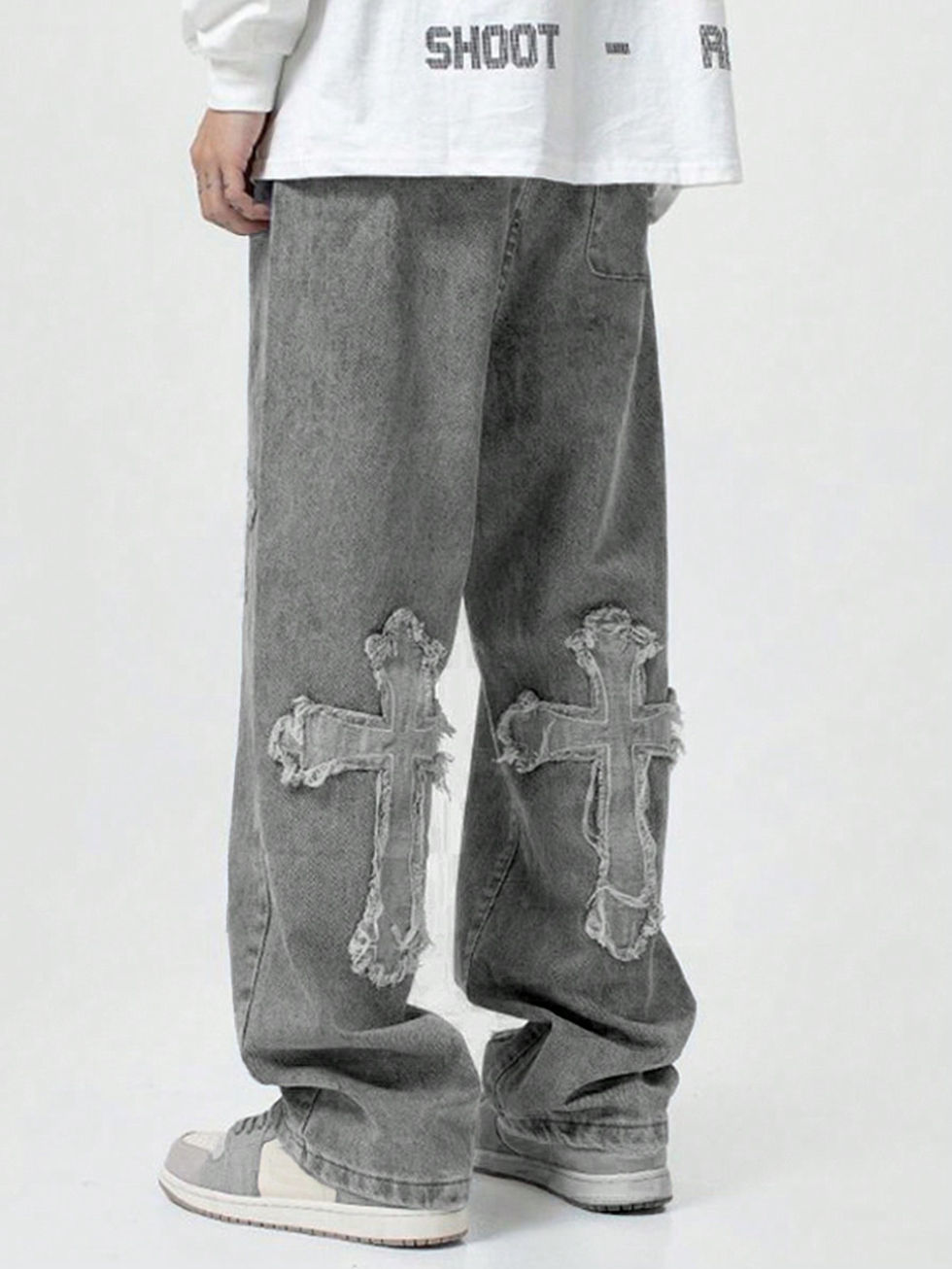 ROMWE Street Life Calça Denim Casual Solta de Perna Reta com Patch Cruzado Masc