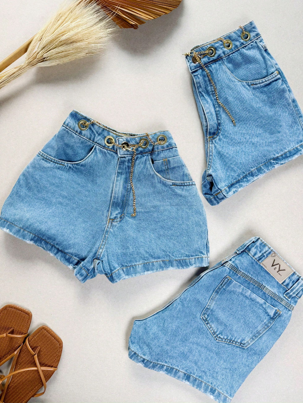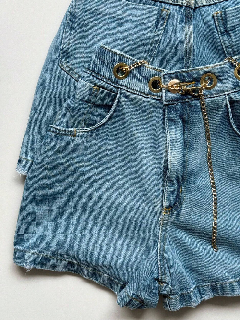 Short Jeans Feminino Ilhós Corretinha Dourada Com Bolso