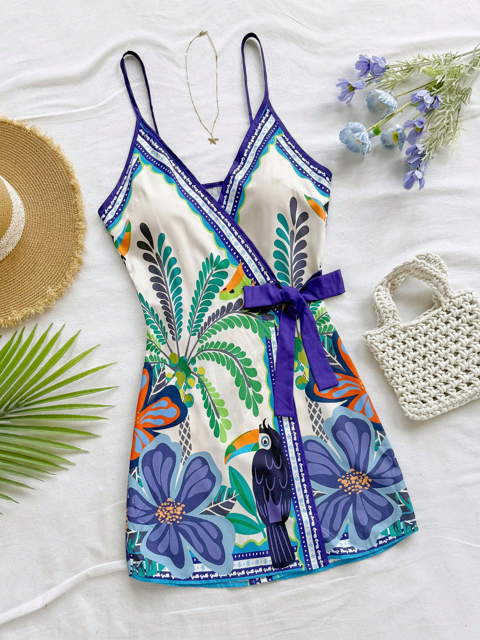 Soleia Vestido Envelope Curto Halterneck Finas com Elementos Tropicais de Féria