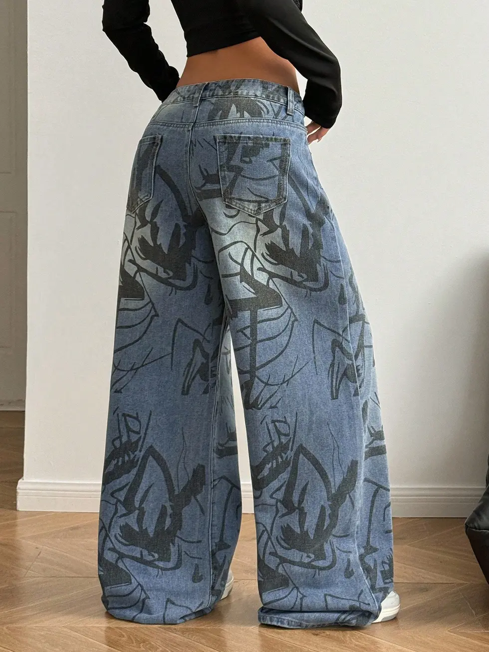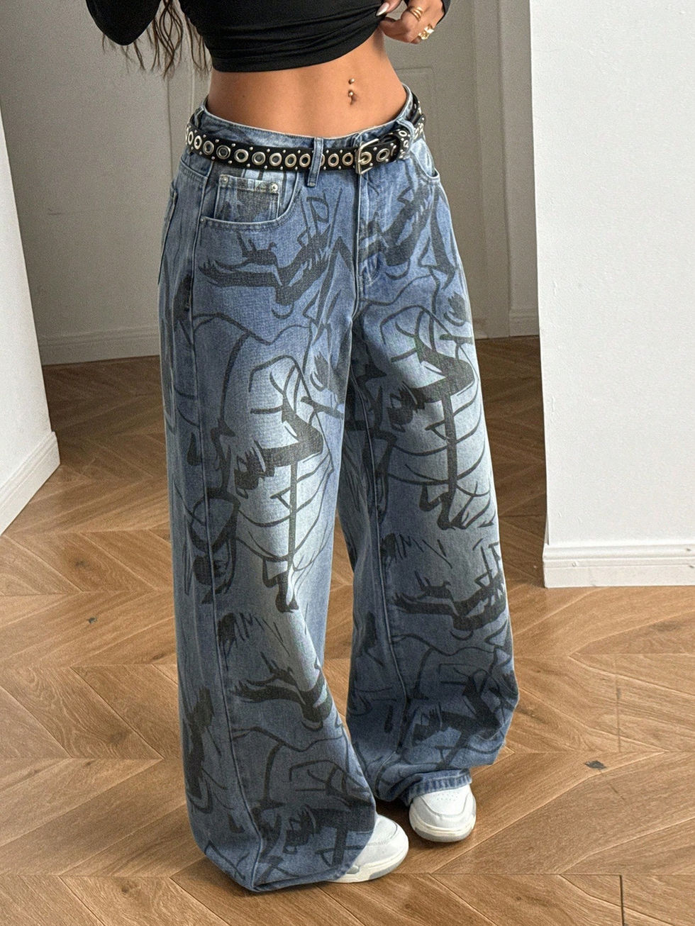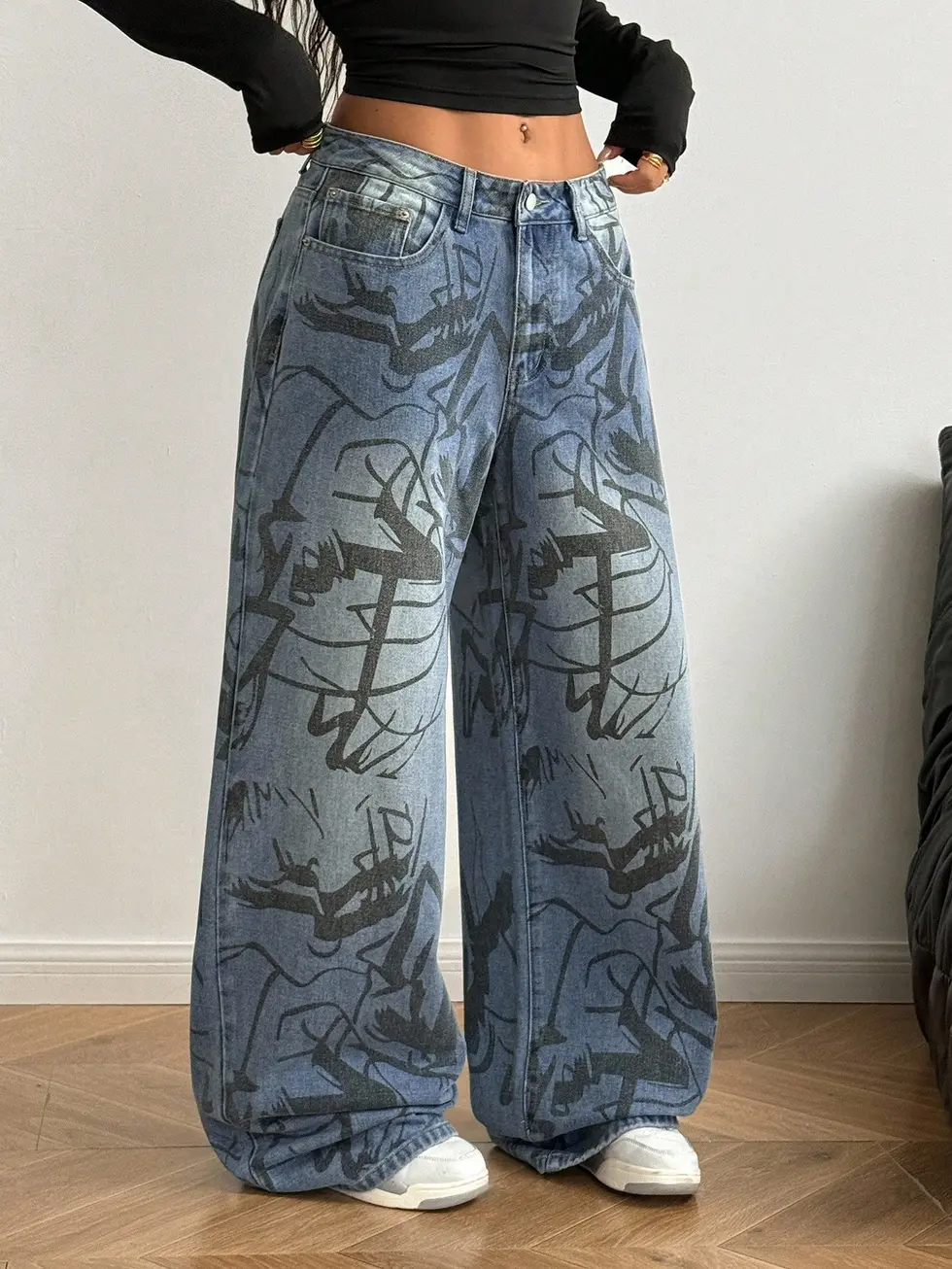 StreetHx Calça Jeans Perna Larga com Estampa de Grafite