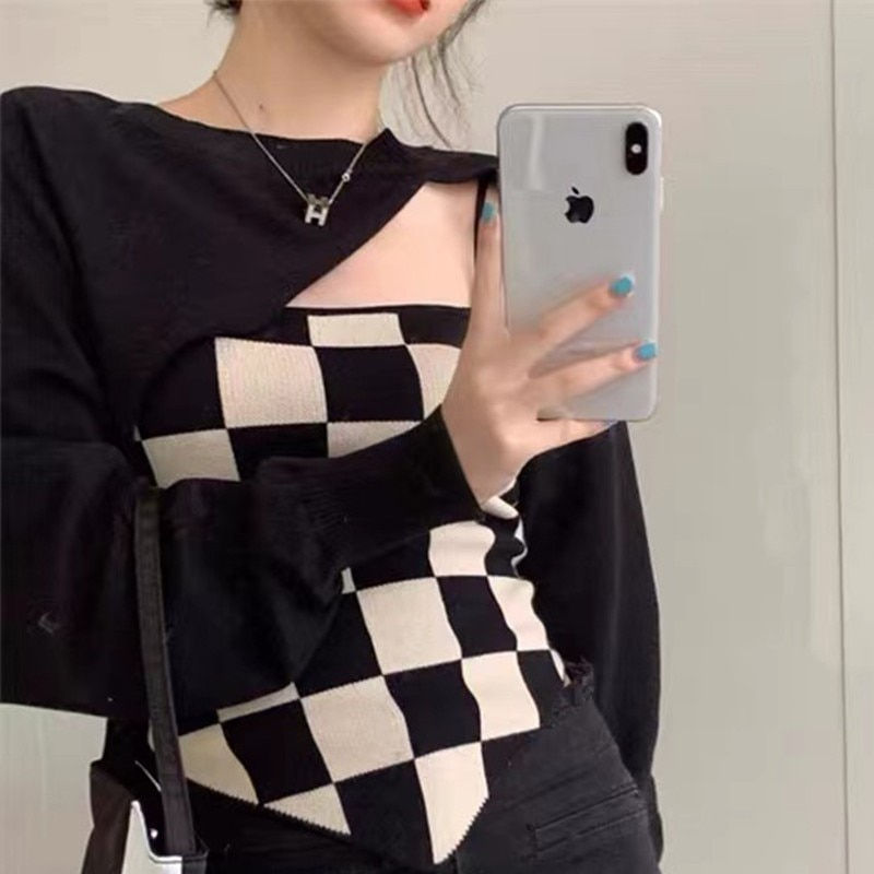 T-shirt gótica feminina Tonngirls de malha preta + xadrez camis regata Y2k