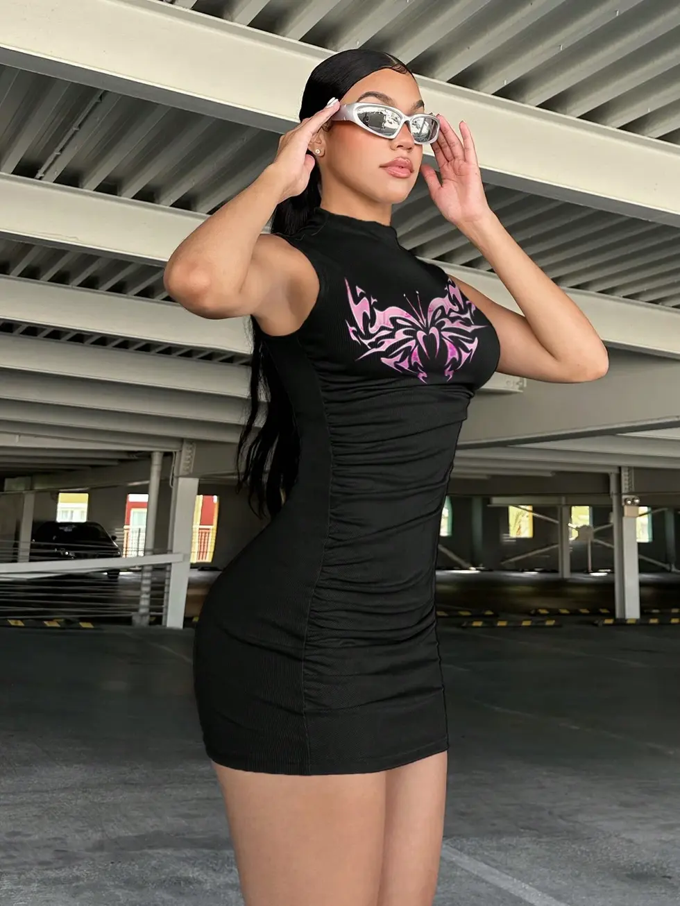 Vestido Curto Sexy Gola Alta Franzido Lateral Feminino
