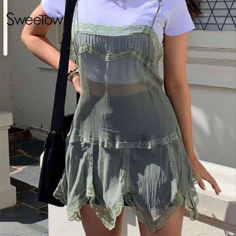 Vestido Slip Sweetown Retro Verde Chiffon Patchwork Renda Feminino