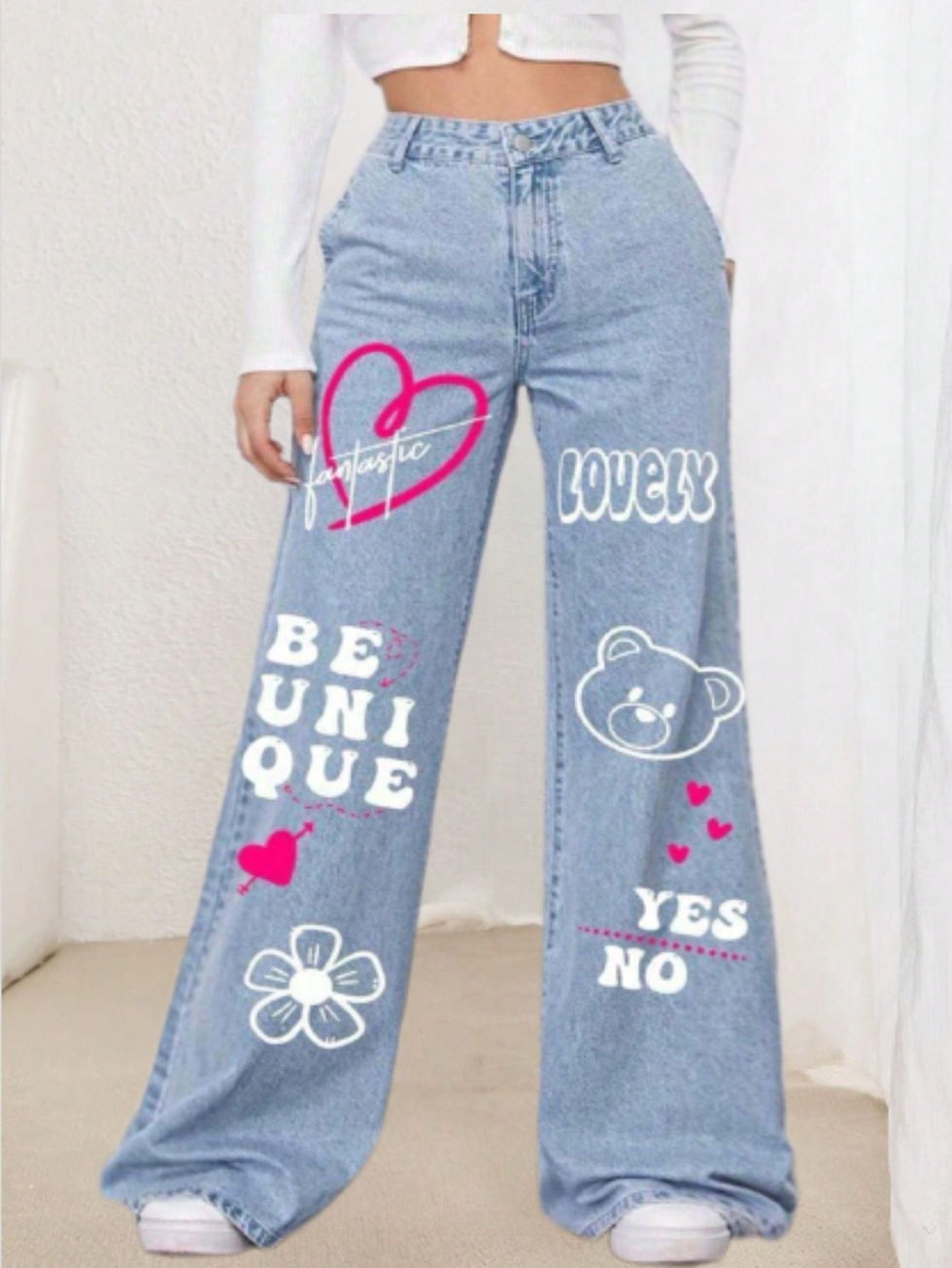 Wide Leg Jeans Estampada Para Garotas Adolescentes Gráfico de Coração & Letra